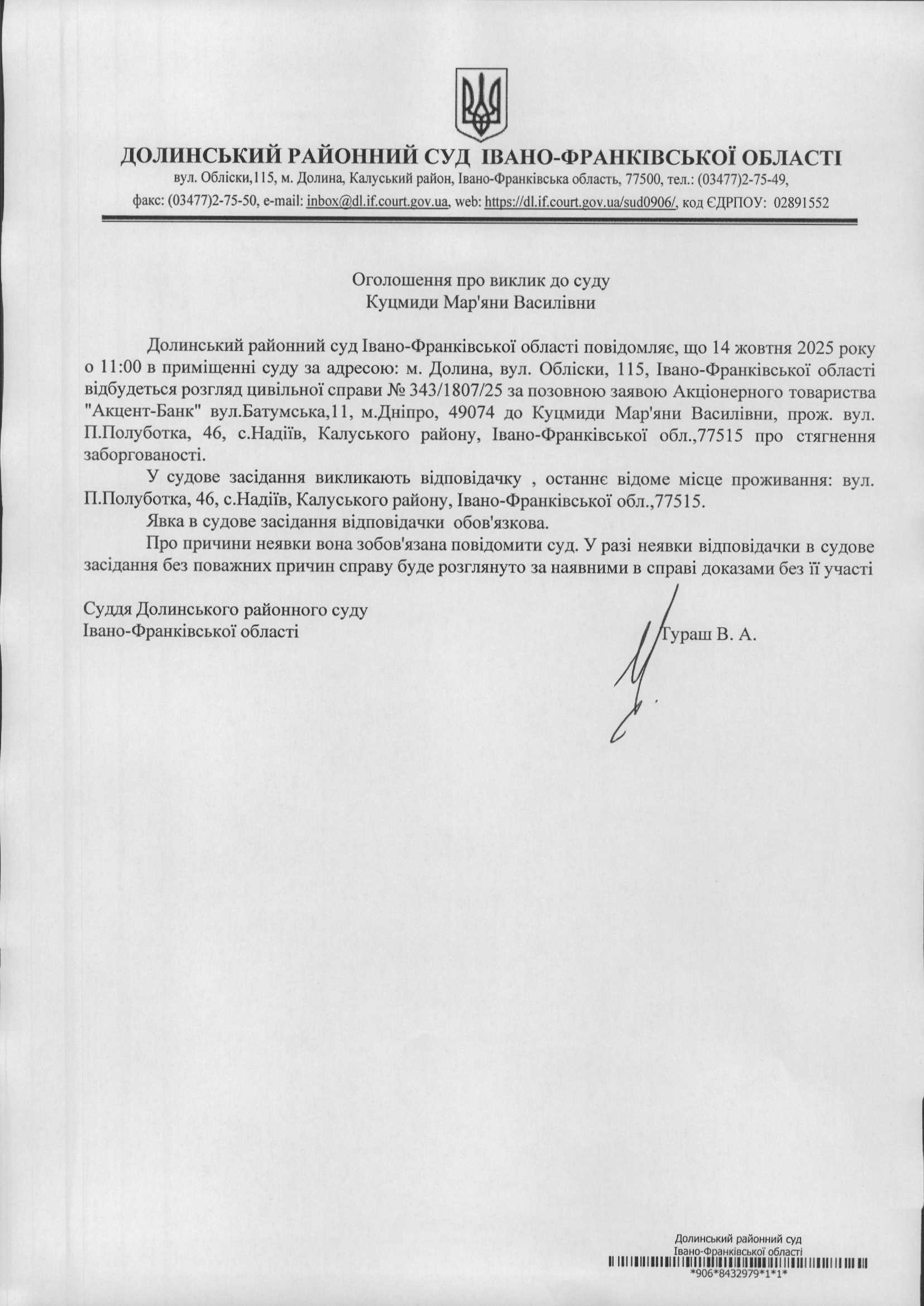 ОГОЛОШЕННЯ ПРО ВИКЛИК до СУДУ Куцмиди Мар'яни Василівни у цивільній справі № 343/1807/25