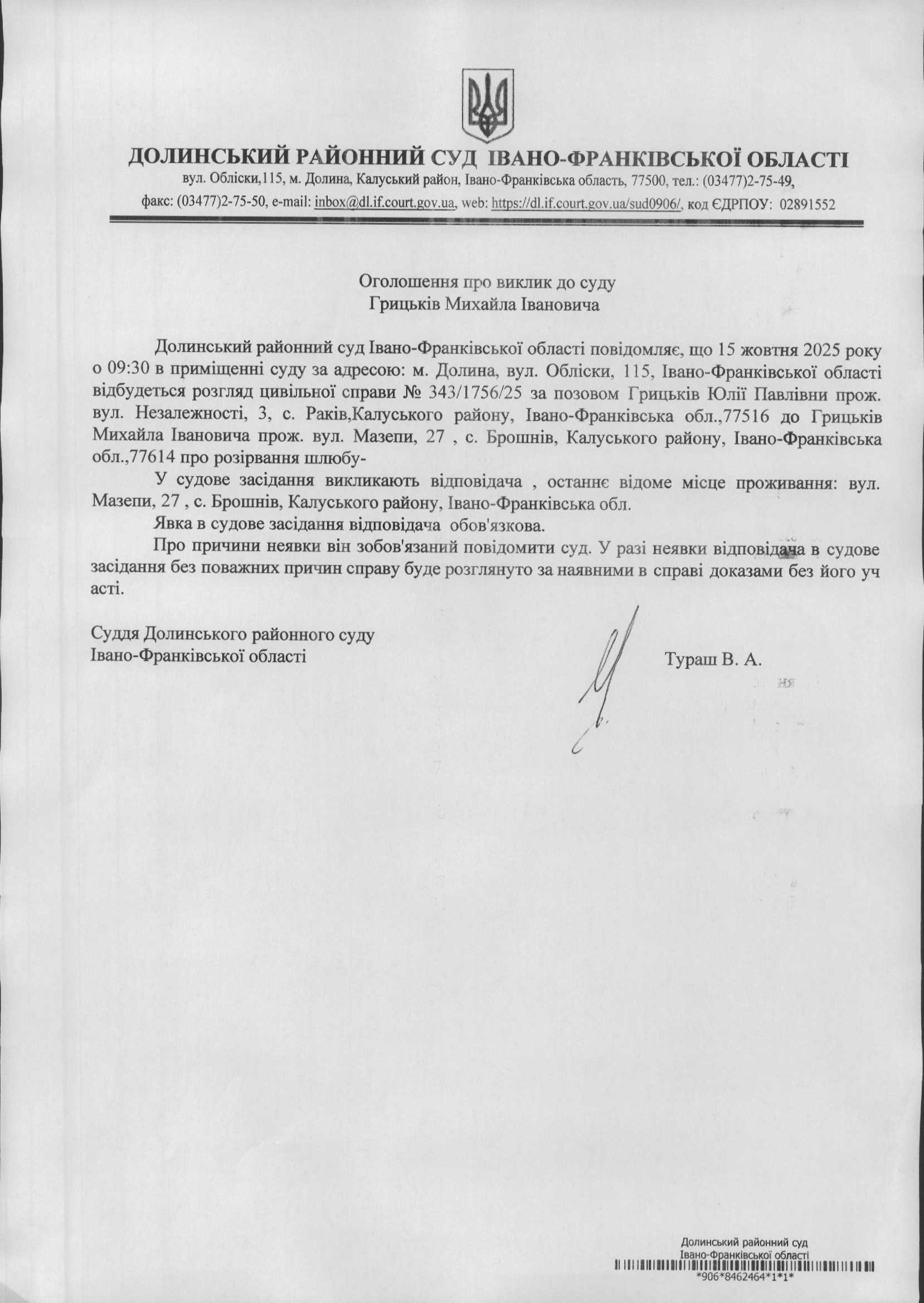 ОГОЛОШЕННЯ ПРО ВИКЛИК до СУДУ Грицків Михайла Івановича у цивільній справі № 343/1756/25