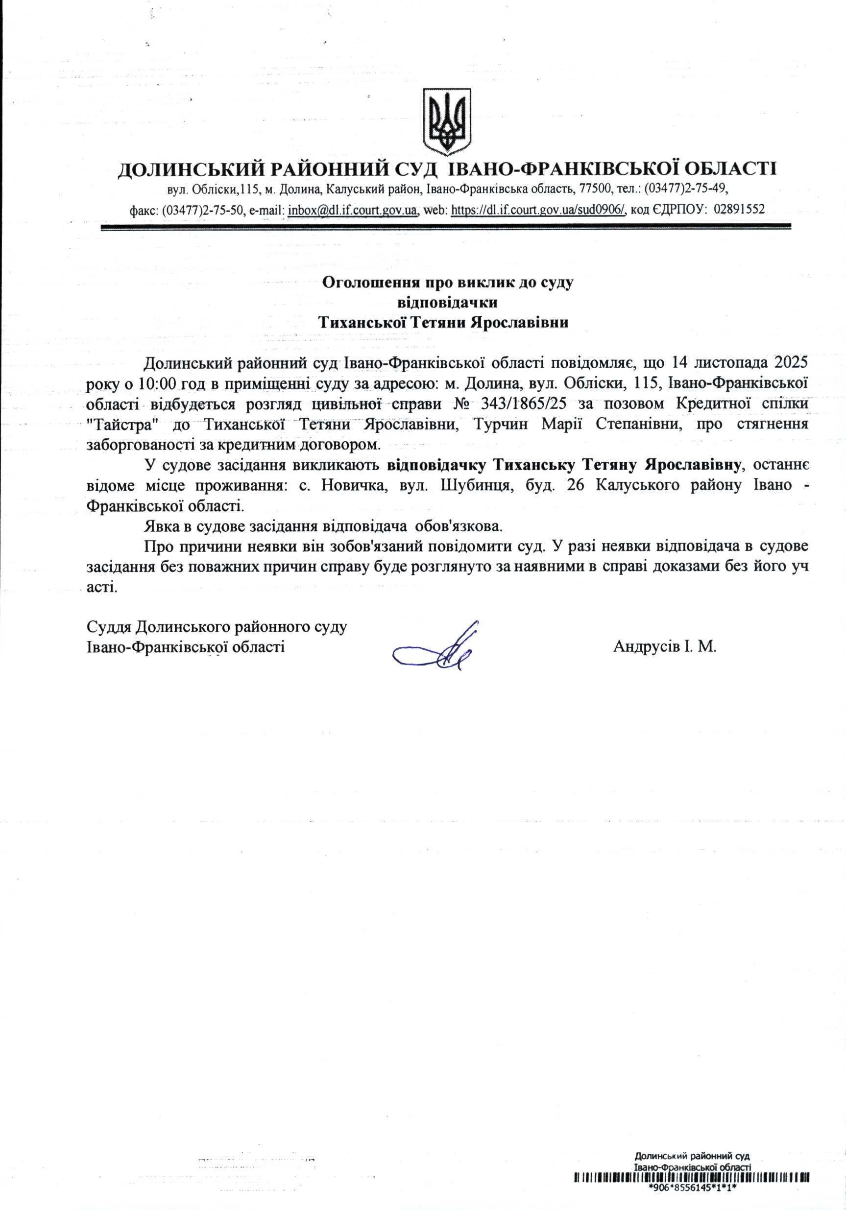 ОГОЛОШЕННЯ ПРО ВИКЛИК до СУДУ відповідачки Тиханської Тетяни Ярославівни у цивільній справі № 343/1865/25