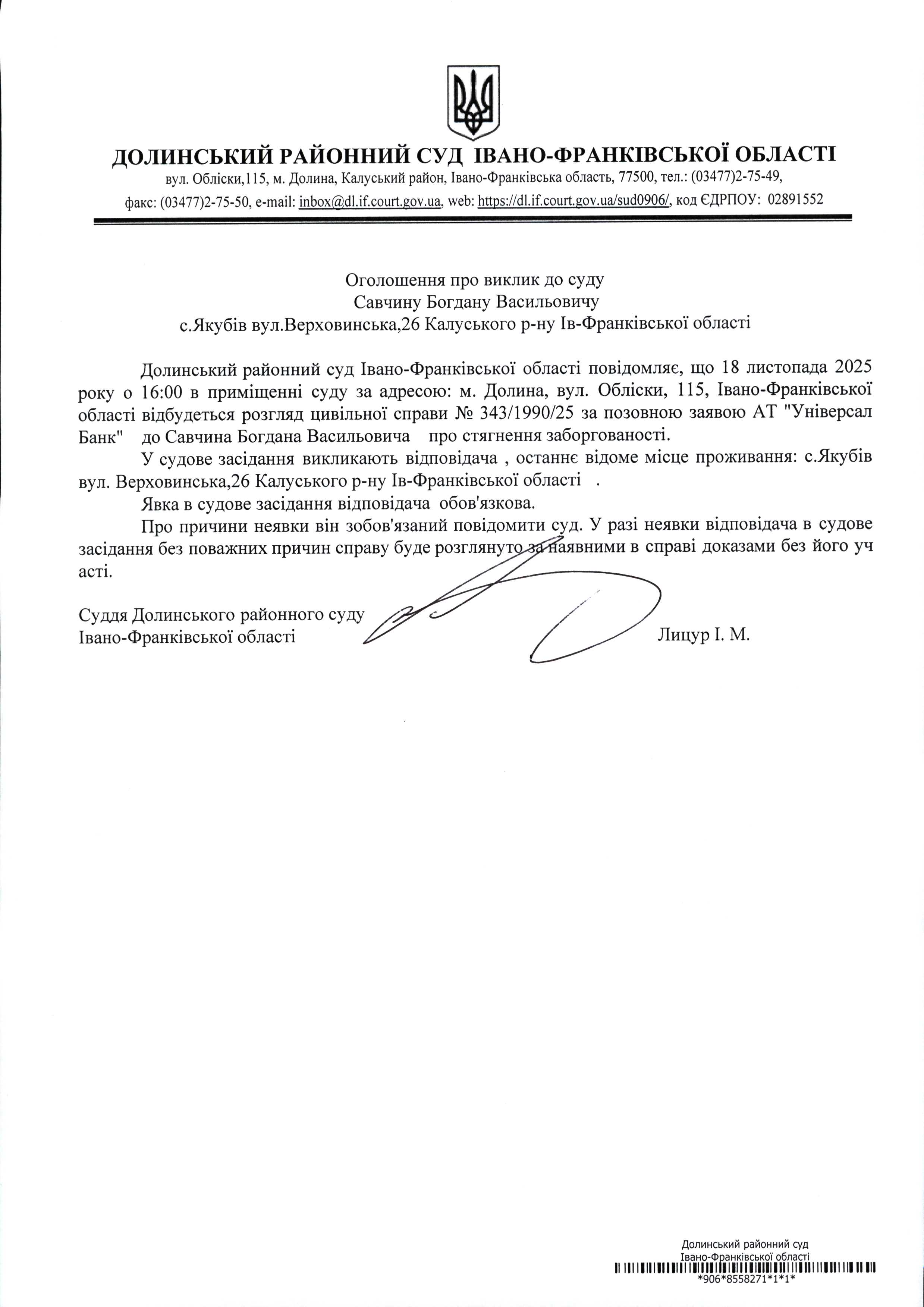ОГОЛОШЕННЯ ПРО ВИКЛИК до СУДУ Савчину Богдану Васильовичу у цивільній справі № 343/1990/25