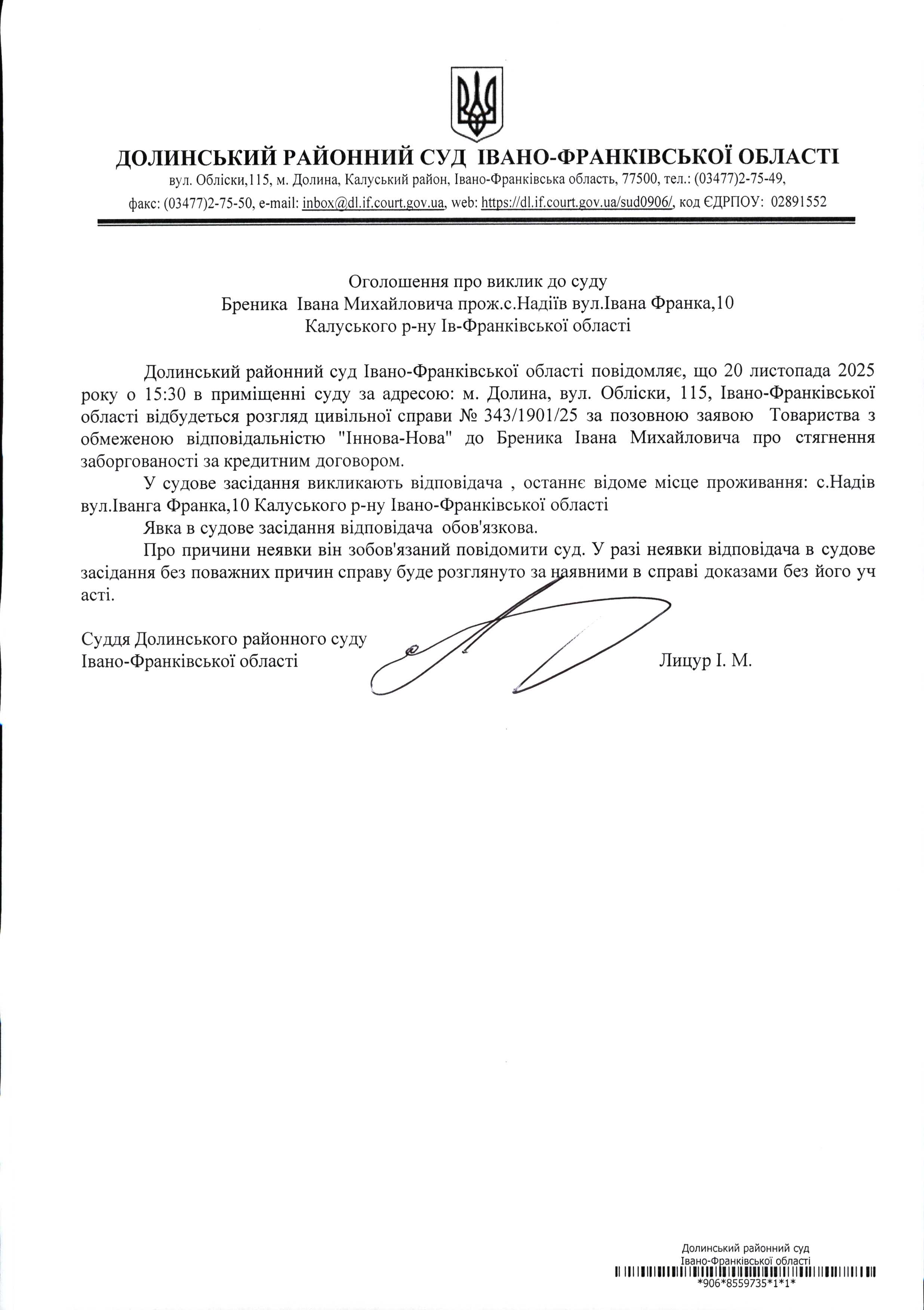ОГОЛОШЕННЯ ПРО ВИКЛИК до СУДУ Бреника Івана Михайловича у цивільній справі № 343/1901/25
