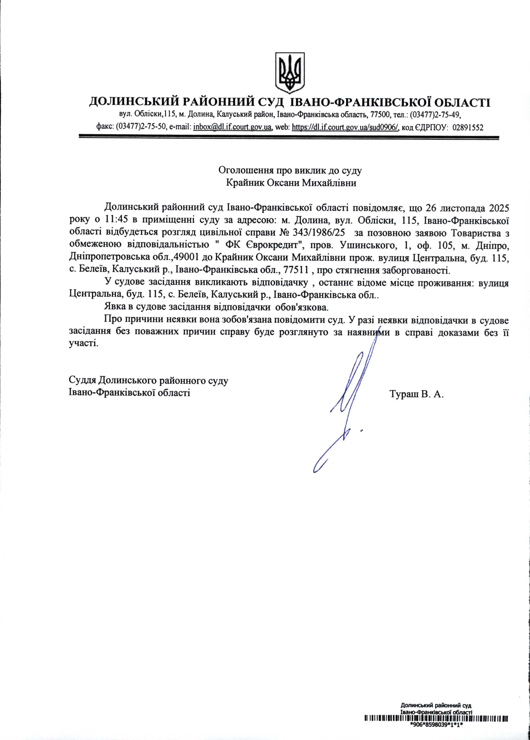 ОГОЛОШЕННЯ ПРО ВИКЛИК до СУДУ Крайник Оксани Михайлівни у цивільній справі № 343/1986/25