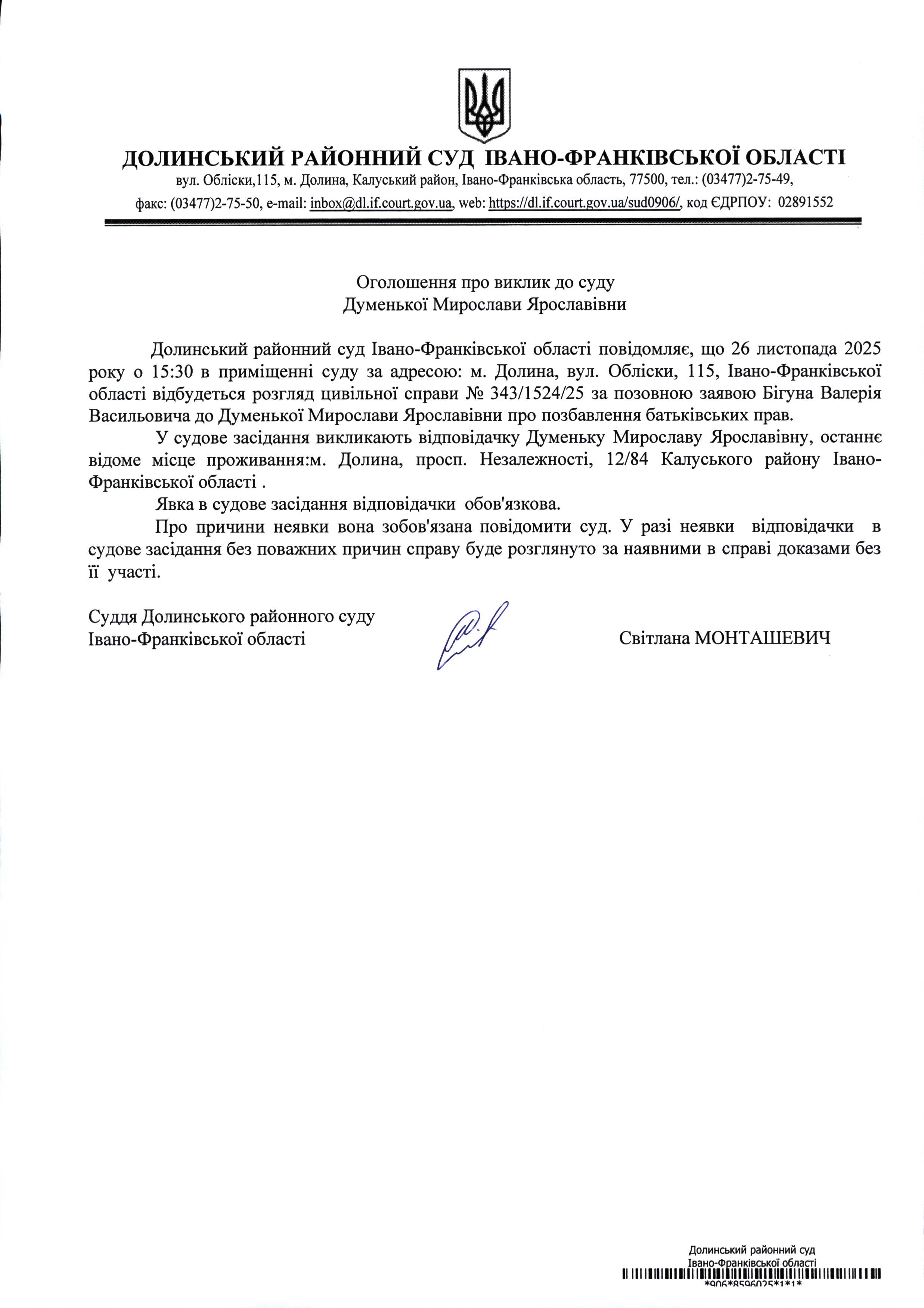 ОГОЛОШЕННЯ ПРО ВИКЛИК до СУДУ Думенької Мирослави Ярославівни у цивільній справі № 343/1524/25