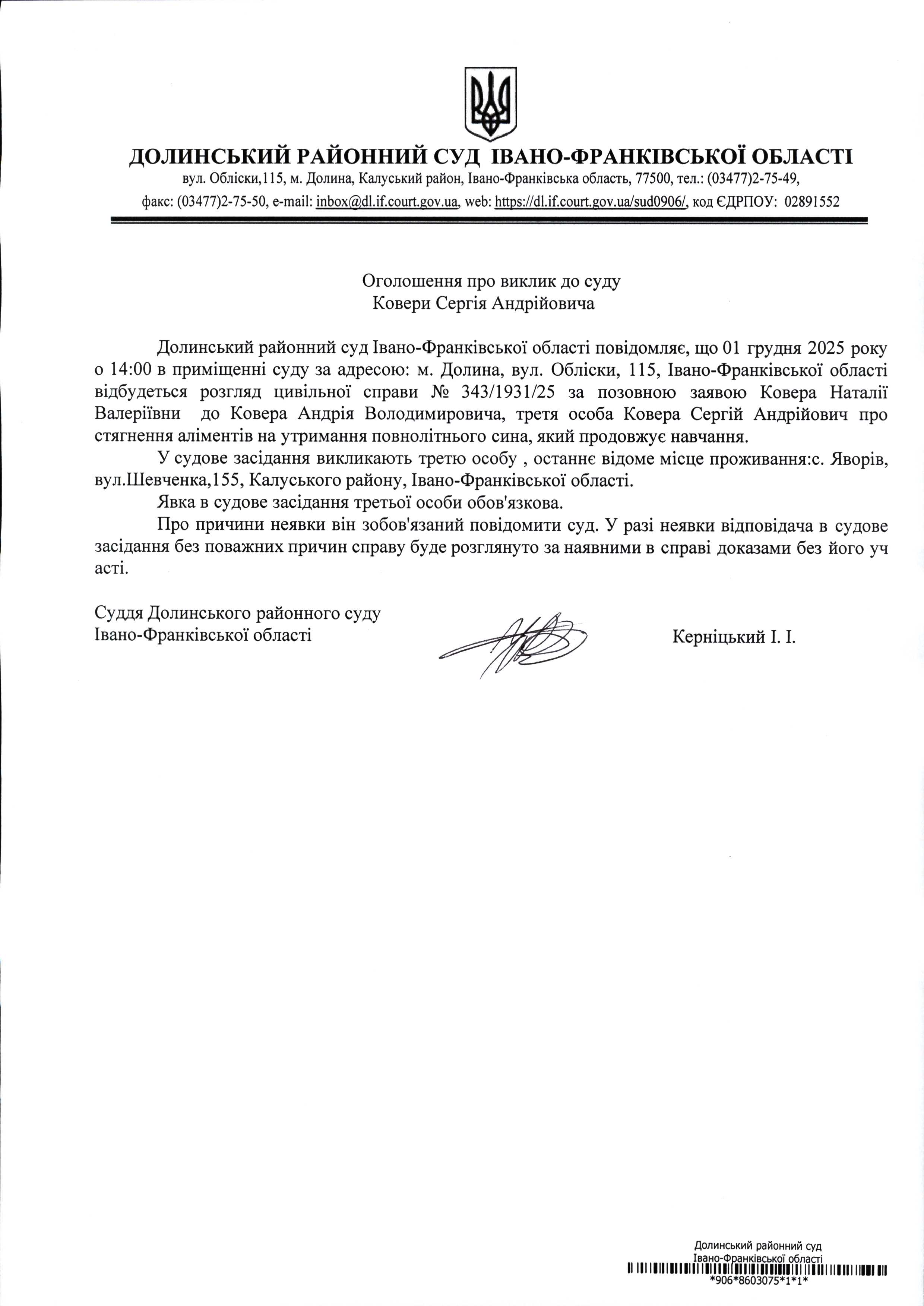 ОГОЛОШЕННЯ ПРО ВИКЛИК до СУДУ Ковери Сергія Андрійовича у цивільній справі № 343/1931/25
