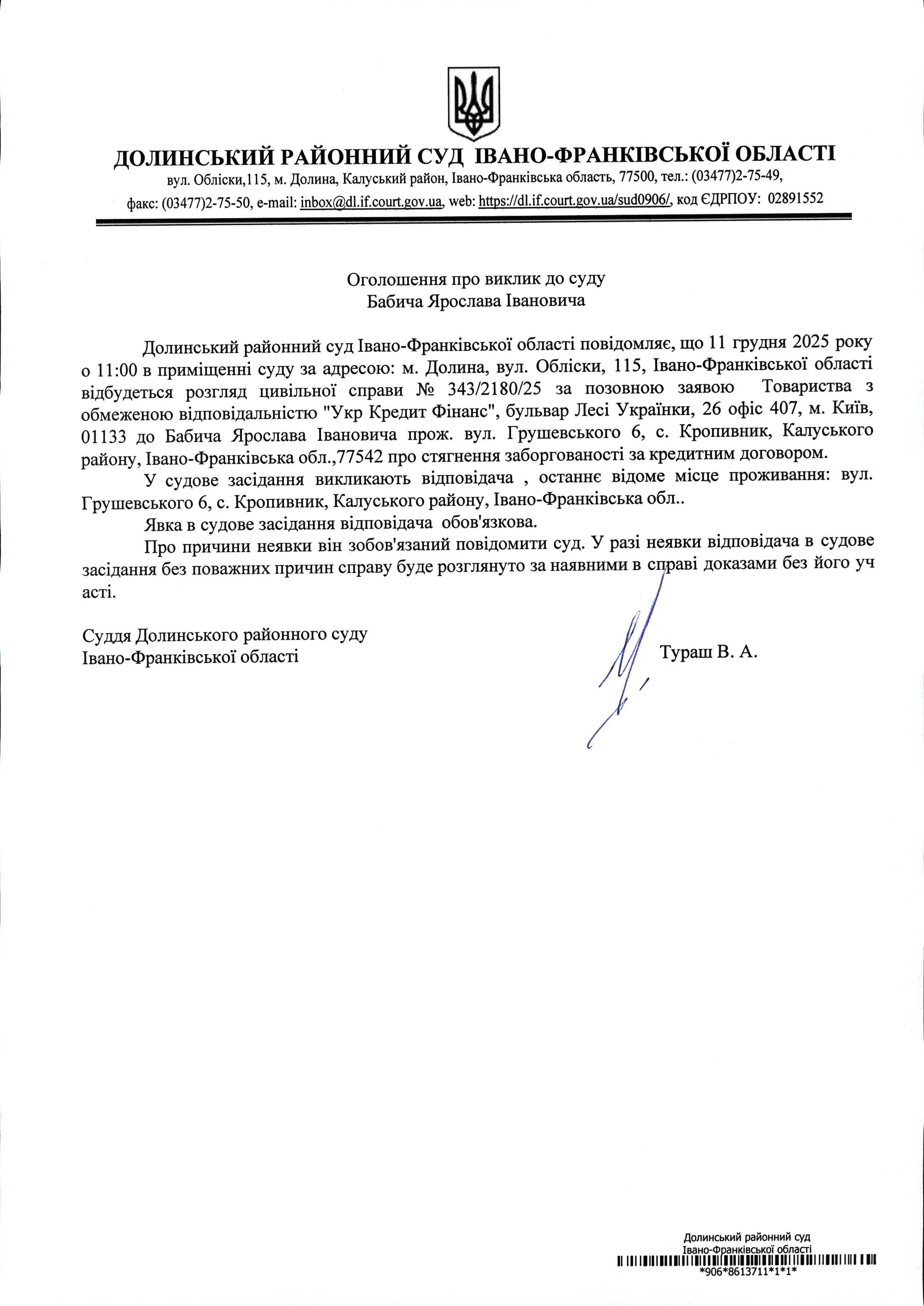 ОГОЛОШЕННЯ ПРО ВИКЛИК до СУДУ Бабича Ярослава Івановича у цивільній справі № 343/2180/25