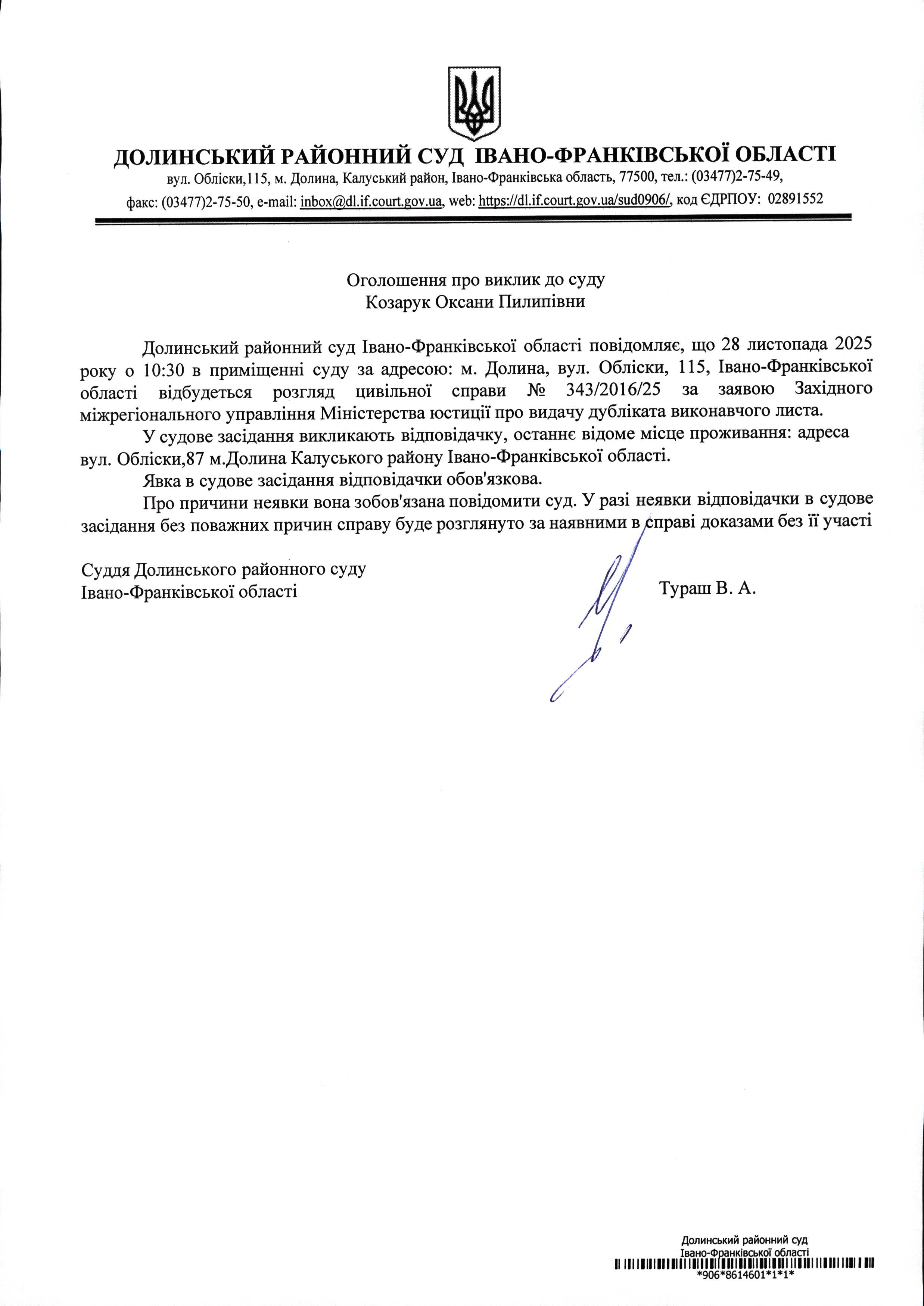 ОГОЛОШЕННЯ ПРО ВИКЛИК до СУДУ Козарчук Оксани Пилипівни у цивільній справі № 343/2016/25