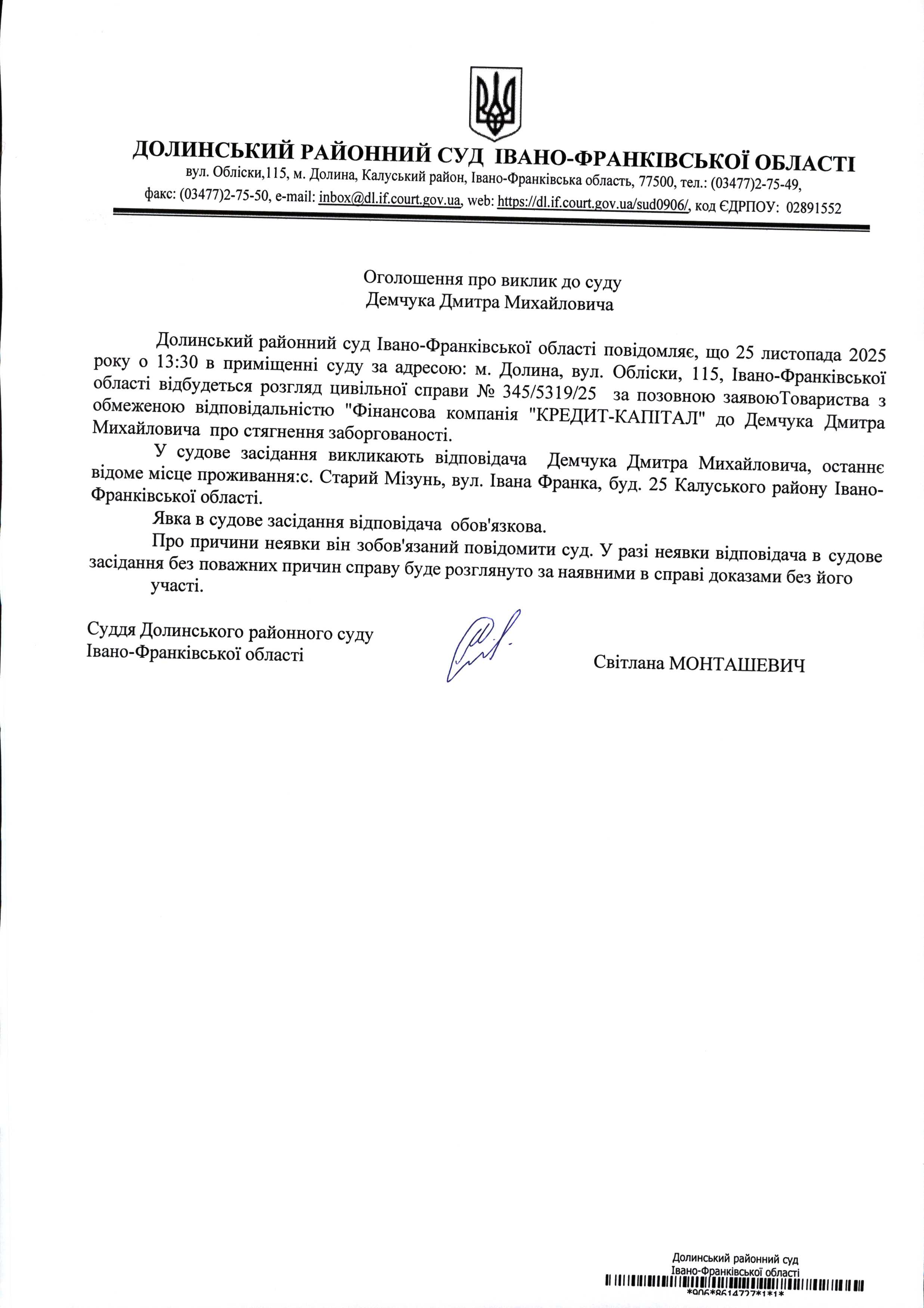 ОГОЛОШЕННЯ ПРО ВИКЛИК до СУДУ Демчука Дмитра Михайловича у цивільній справі № 345/5319/25