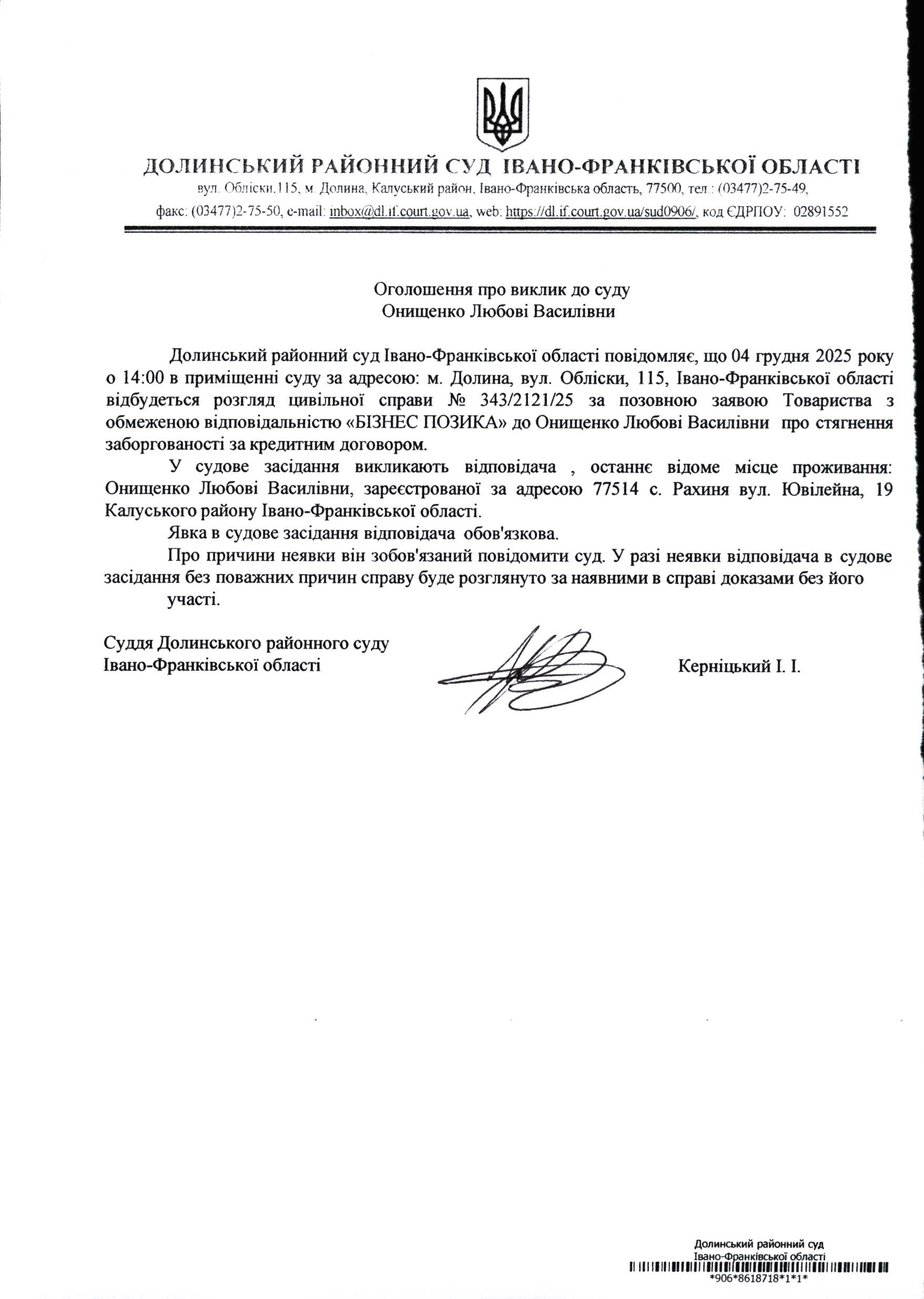 ОГОЛОШЕННЯ ПРО ВИКЛИК до СУДУ Онищенко Любові Василівни у цивільній справі № 343/2121/25