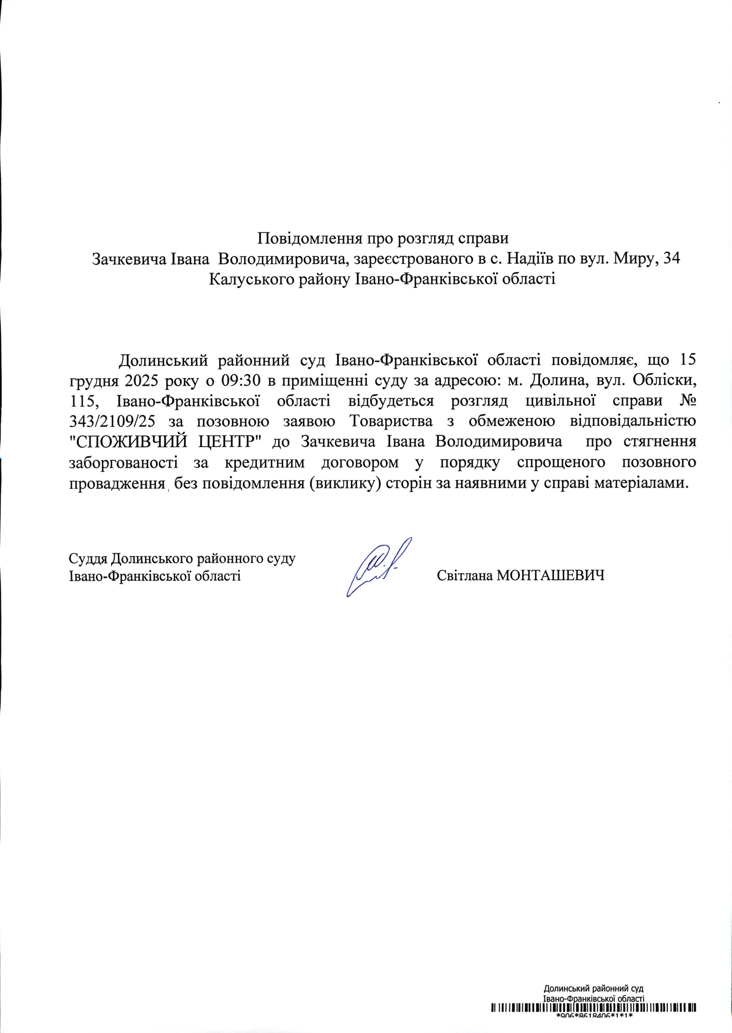 Повідомлення про розгляд справи Зачкевича Івана Володимировича 343/2109/25