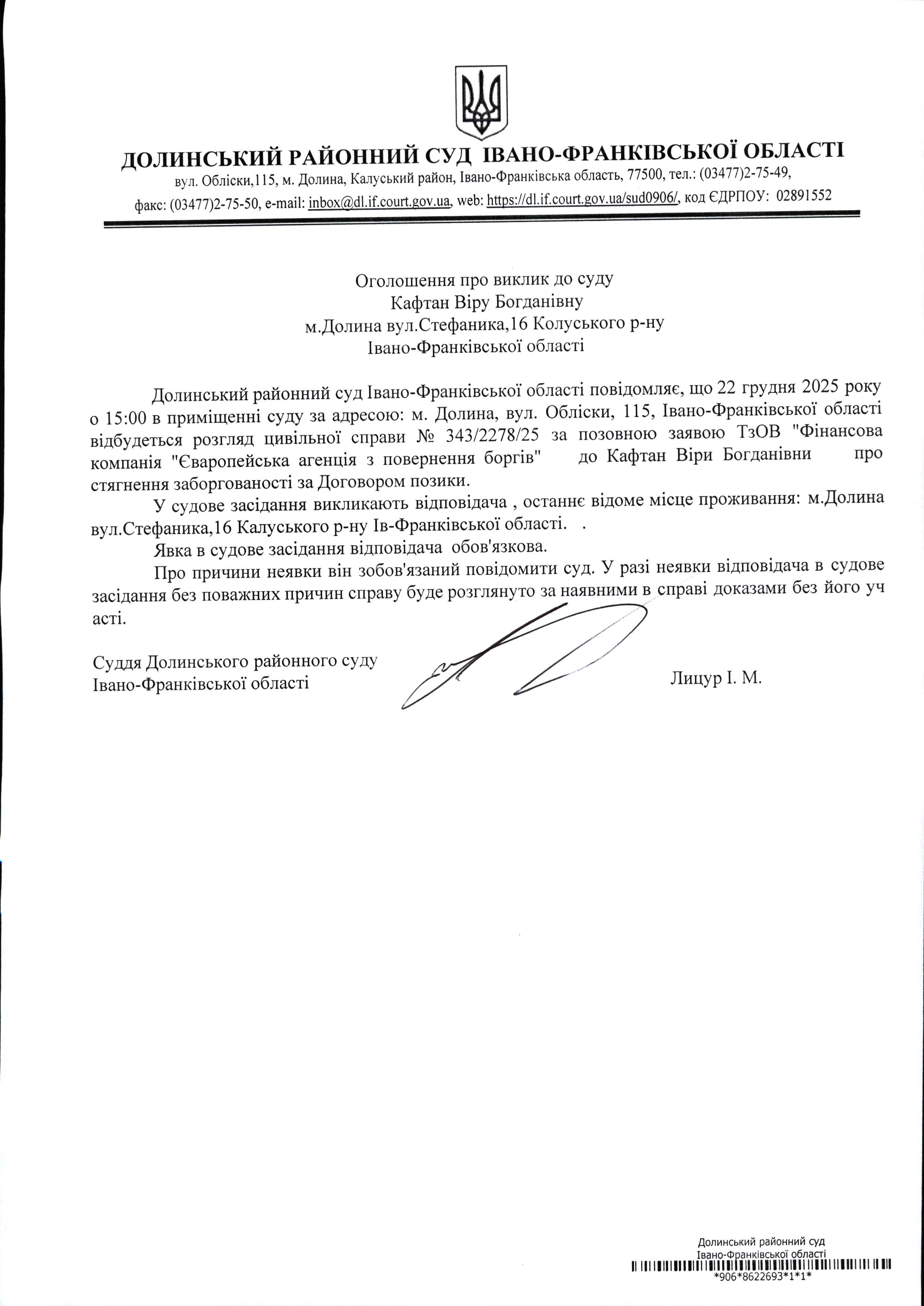 ОГОЛОШЕННЯ ПРО ВИКЛИК до СУДУ Кафтан Віру Богданівну у цивільній справі № 343/2278/25