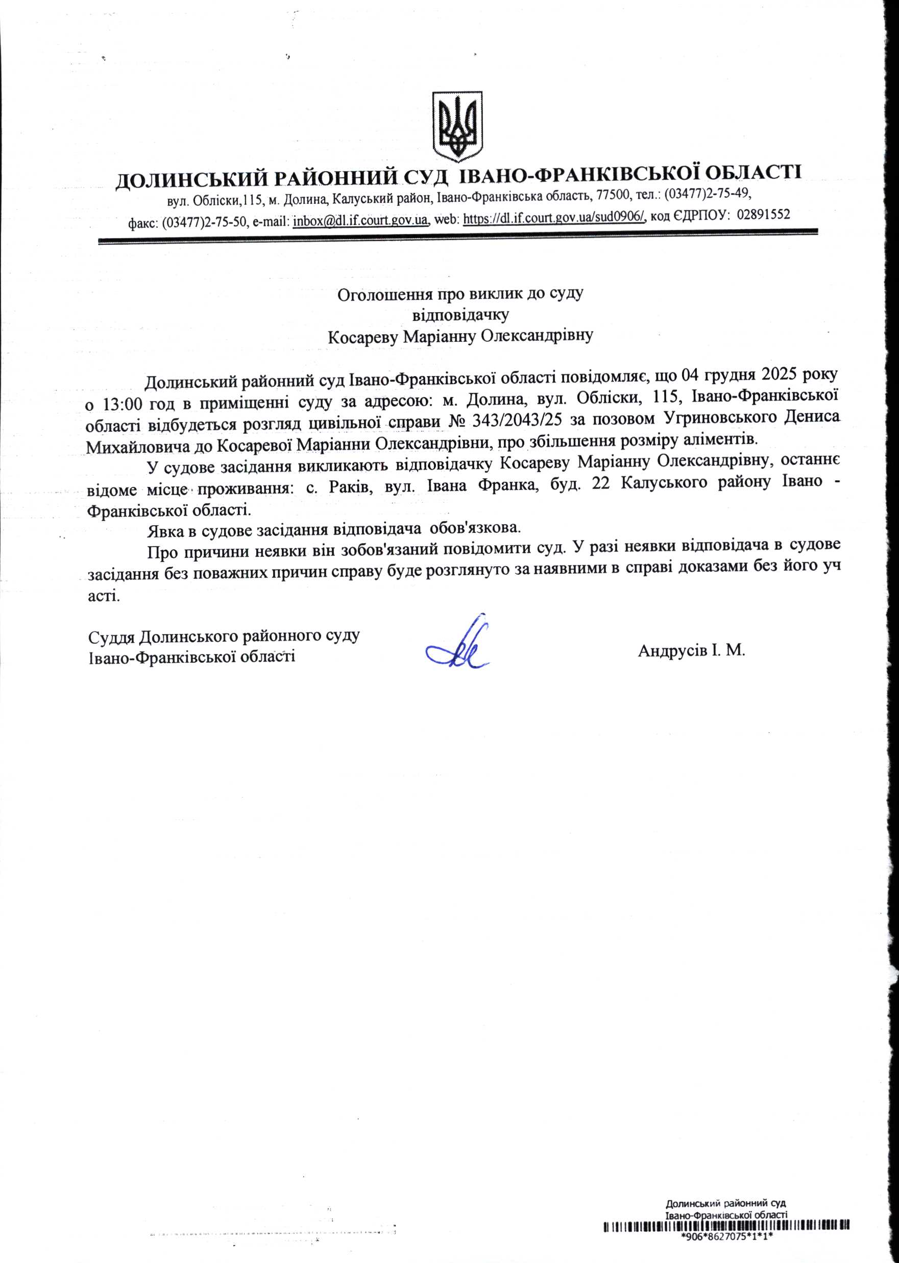 ОГОЛОШЕННЯ ПРО ВИКЛИК до СУДУ відповідачку Косареву Маріану Олександрівну у цивільній справі № 343/2043/25