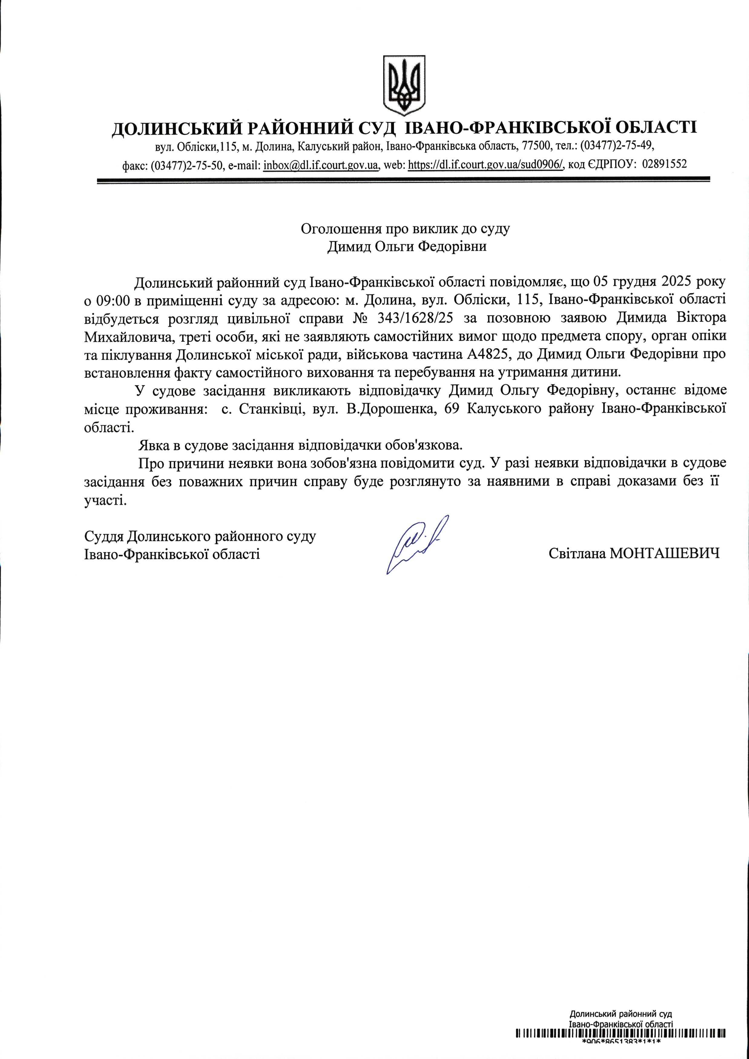 ОГОЛОШЕННЯ ПРО ВИКЛИК до СУДУ Димид Ольги Федорівни у цивільній справі № 343/1628/25