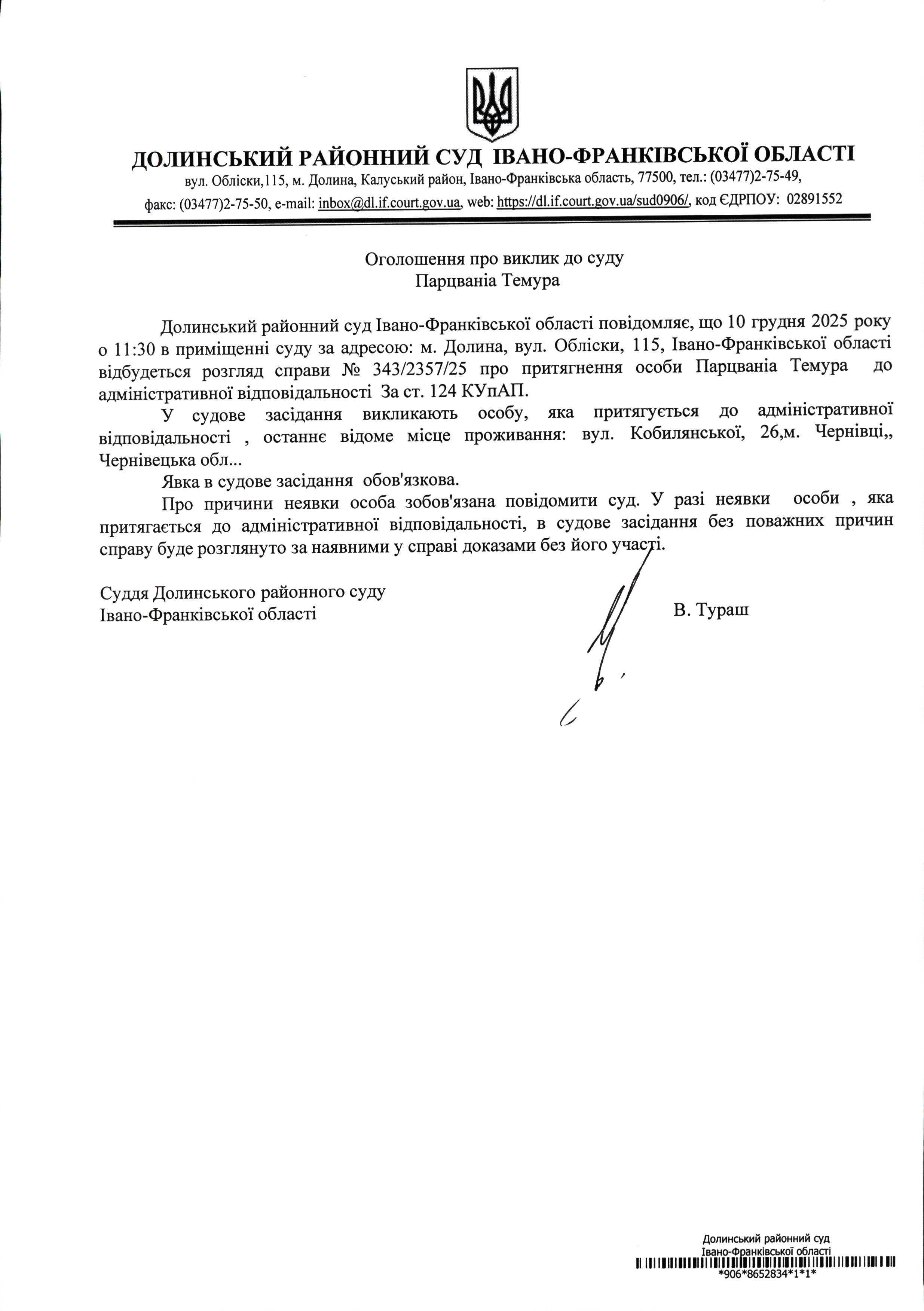 ОГОЛОШЕННЯ ПРО ВИКЛИК до СУДУ Парцваніа Темура у справі про адміністративне правопорушення № 343/2357/25