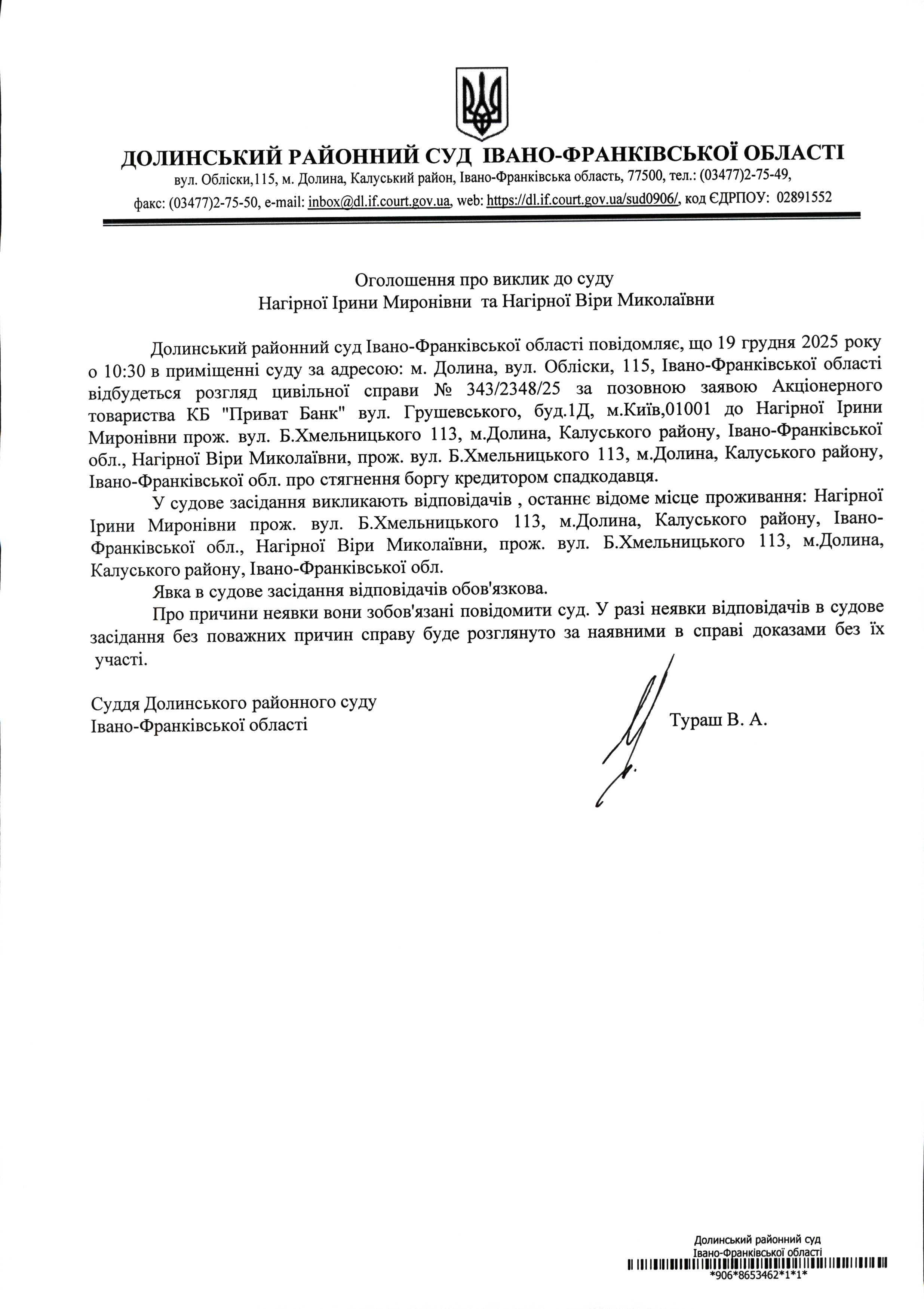 ОГОЛОШЕННЯ ПРО ВИКЛИК до СУДУ Нагірної Ірини Миронівни та Нагірної Віри Миколаївни у цивільній справі № 343/2348/25