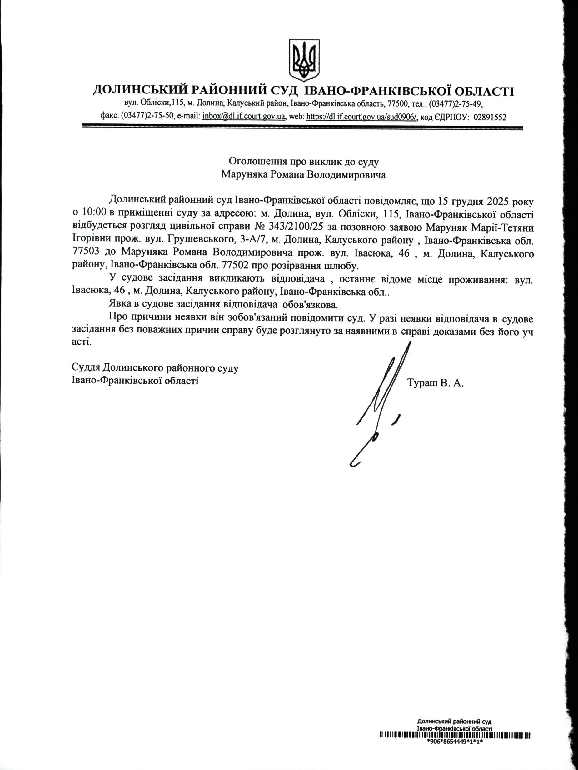 ОГОЛОШЕННЯ ПРО ВИКЛИК до СУДУ Маруняка Романа Володимировича у цивільній справі № 343/2100/25