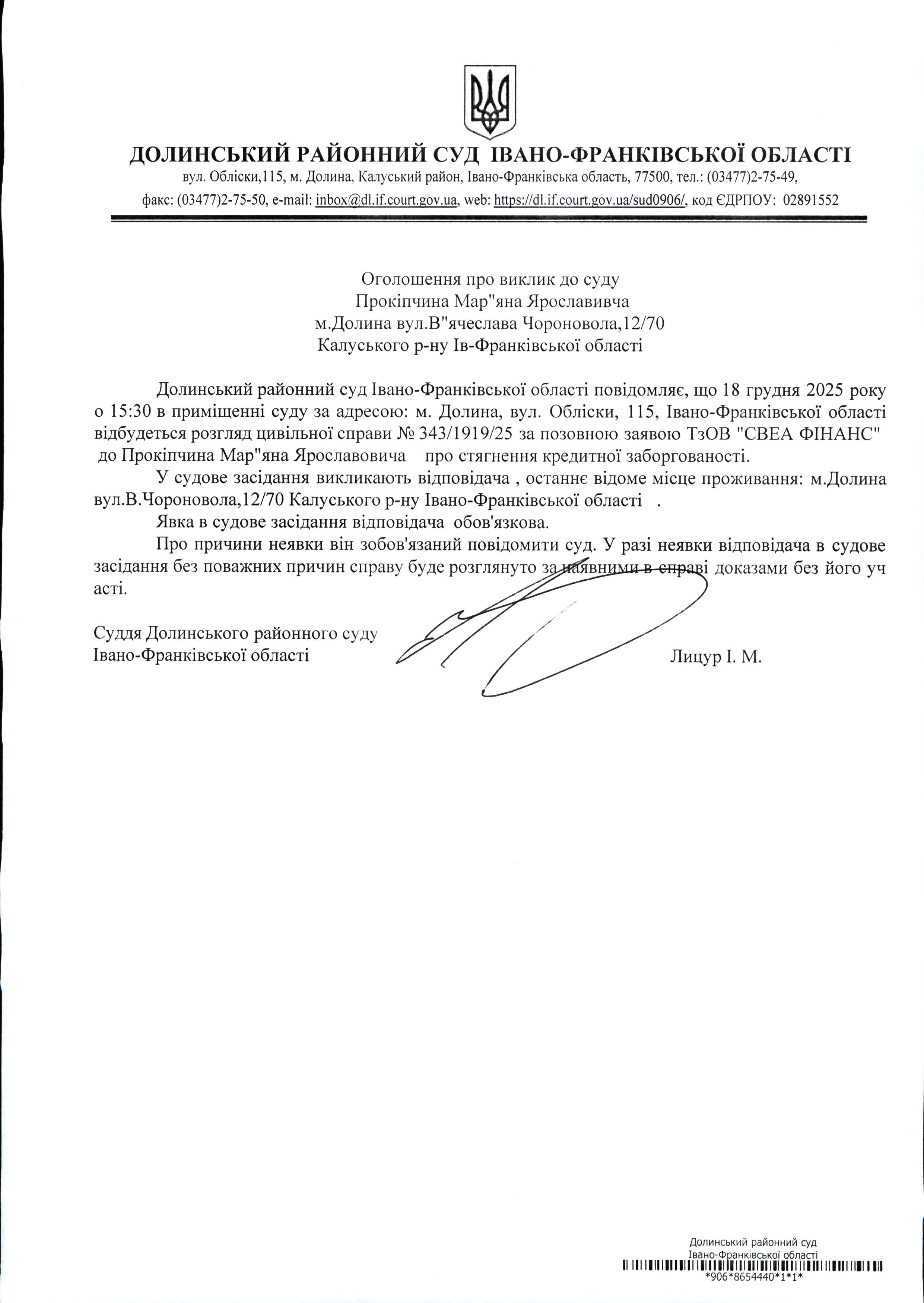 ОГОЛОШЕННЯ ПРО ВИКЛИК до СУДУ Прокіпчина Мар'яна Ярославовича у цивільній справі № 343/1919/25