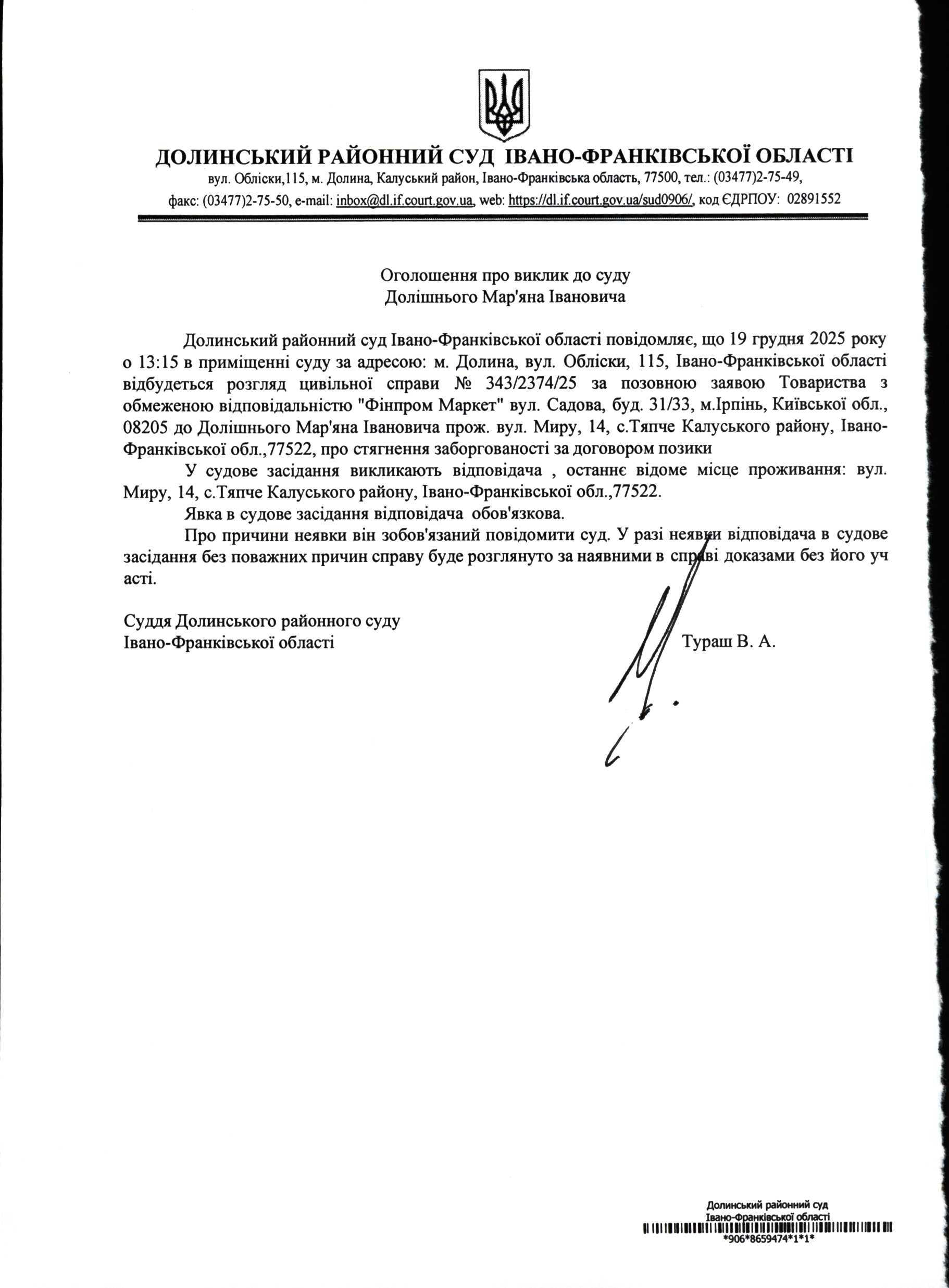 ОГОЛОШЕННЯ ПРО ВИКЛИК до СУДУ Долішнього Мар'яна Івановича у цивільній справі № 343/2374/25