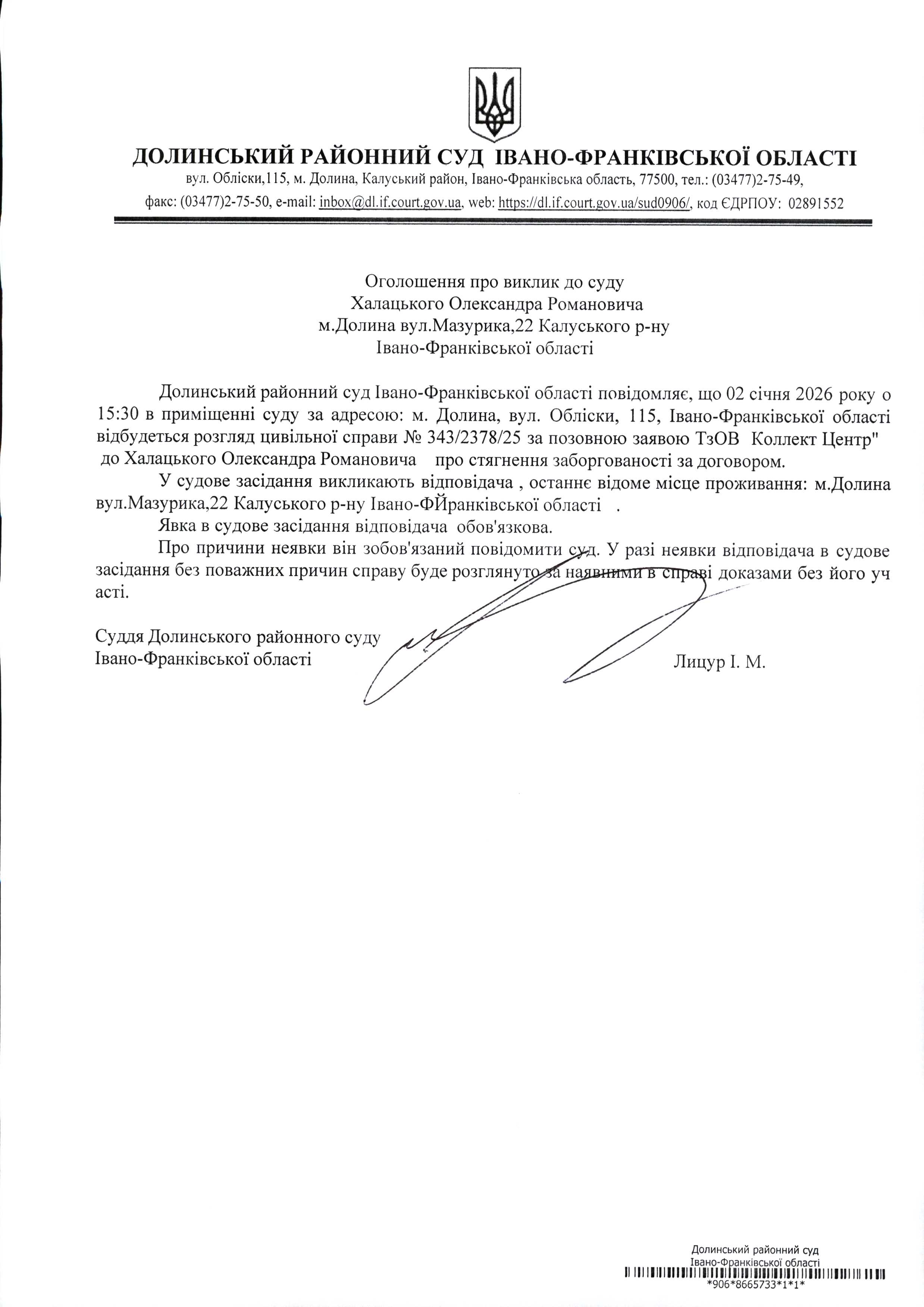 ОГОЛОШЕННЯ ПРО ВИКЛИК до СУДУ Халацького Олександра Романовича у цивільній справі № 343/2378/25
