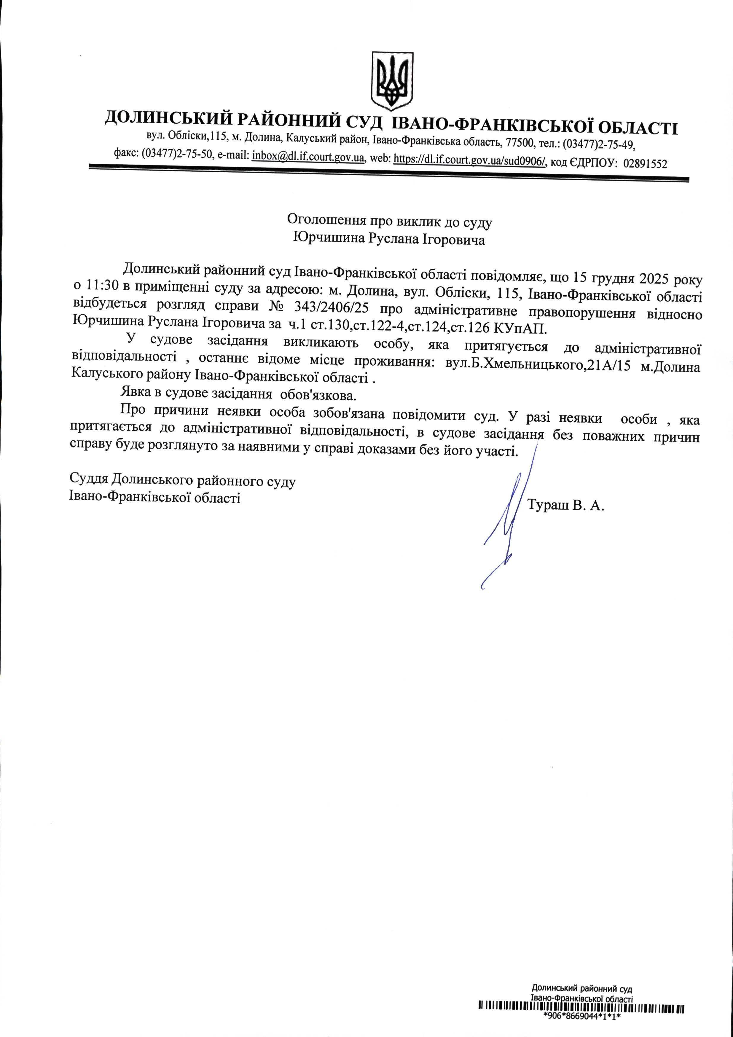ОГОЛОШЕННЯ ПРО ВИКЛИК до СУДУ Юрчишина Руслана Ігоровича у цивільній справі № 343/2406/25