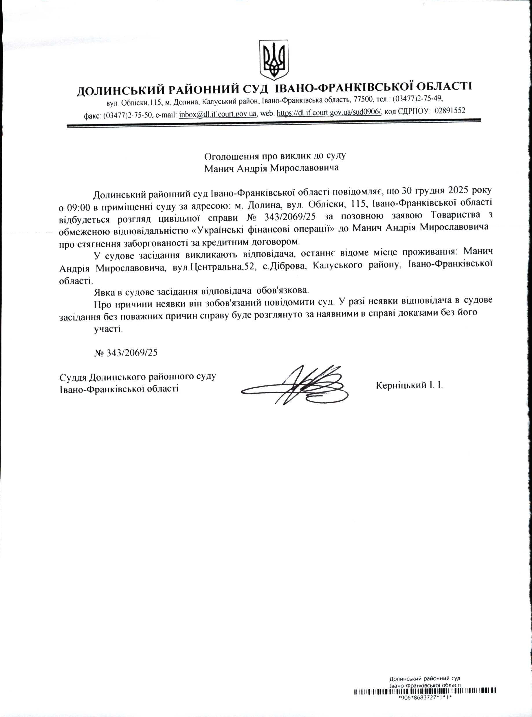 ОГОЛОШЕННЯ ПРО ВИКЛИК до СУДУ Манич Андрія Мирославовича у цивільній справі № 343/2069/25