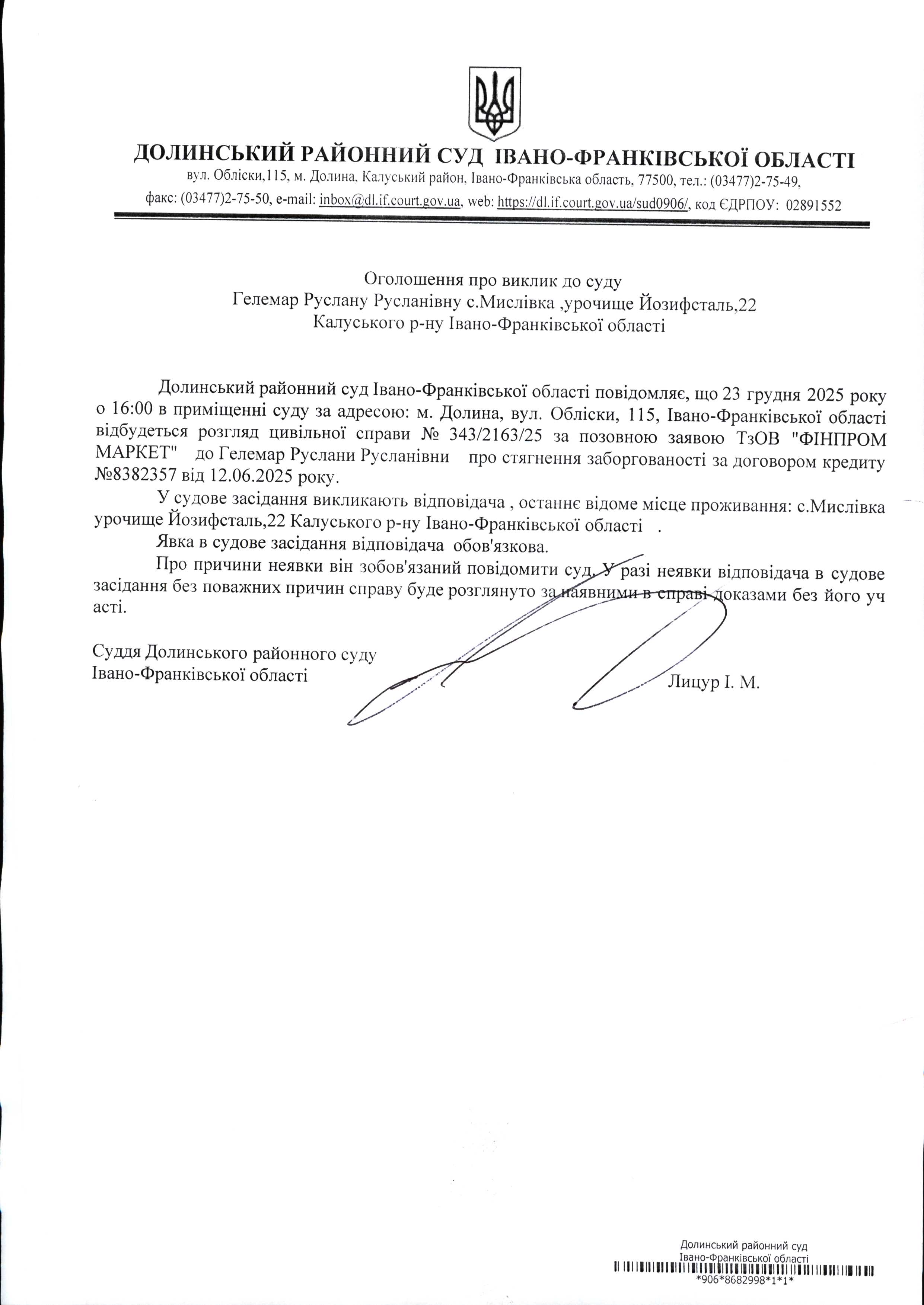 ОГОЛОШЕННЯ ПРО ВИКЛИК до СУДУ Гелемар Руслану Русланівну у цивільній справі № 343/2163/25