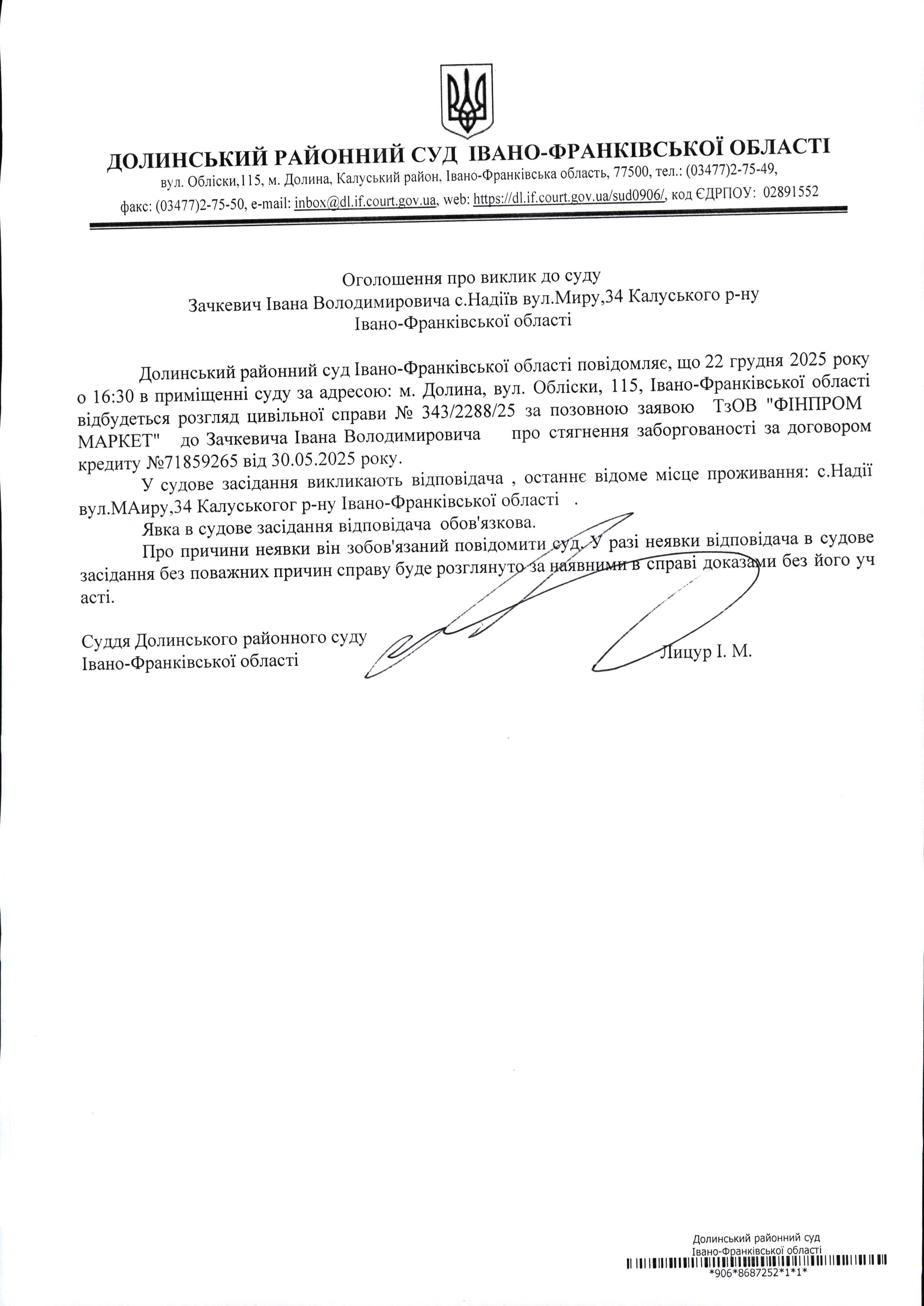 ОГОЛОШЕННЯ ПРО ВИКЛИК до СУДУ Зачкевич Івана Володимировича у цивільній справі № 343/2288/25