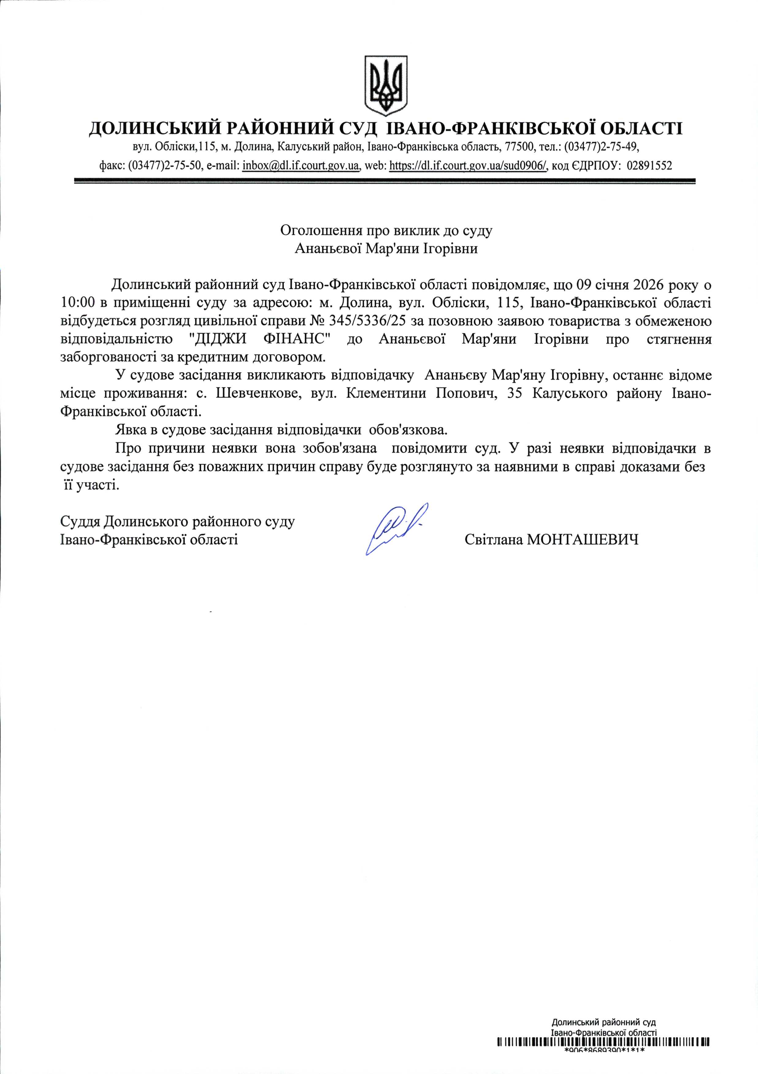 ОГОЛОШЕННЯ ПРО ВИКЛИК до СУДУ Ананьєвої Мар'яни Ігорівни у цивільній справі № 345/5336/25