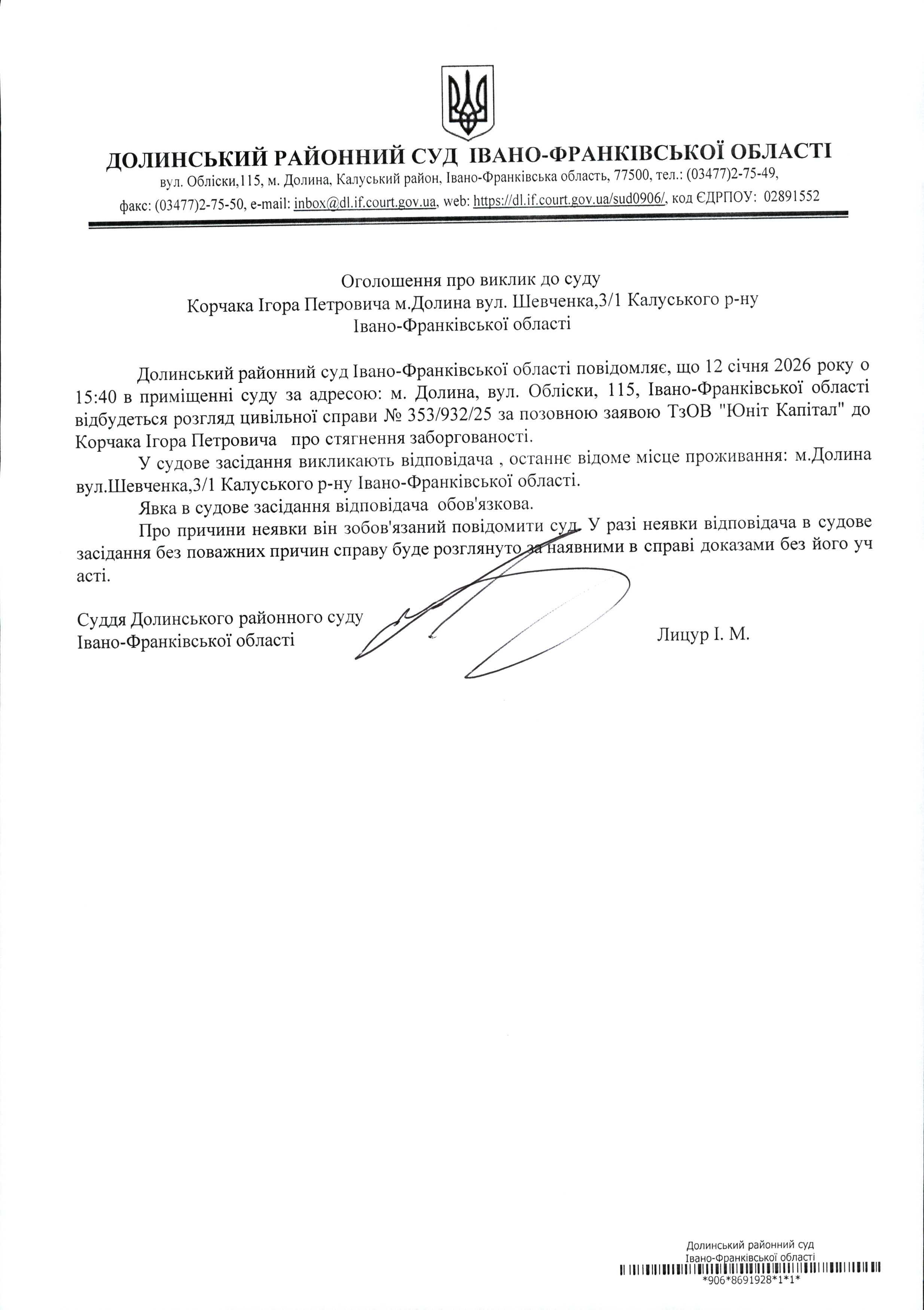 ОГОЛОШЕННЯ ПРО ВИКЛИК до СУДУ Корчака Ігора Петровича у цивільній справі № 353/932/25