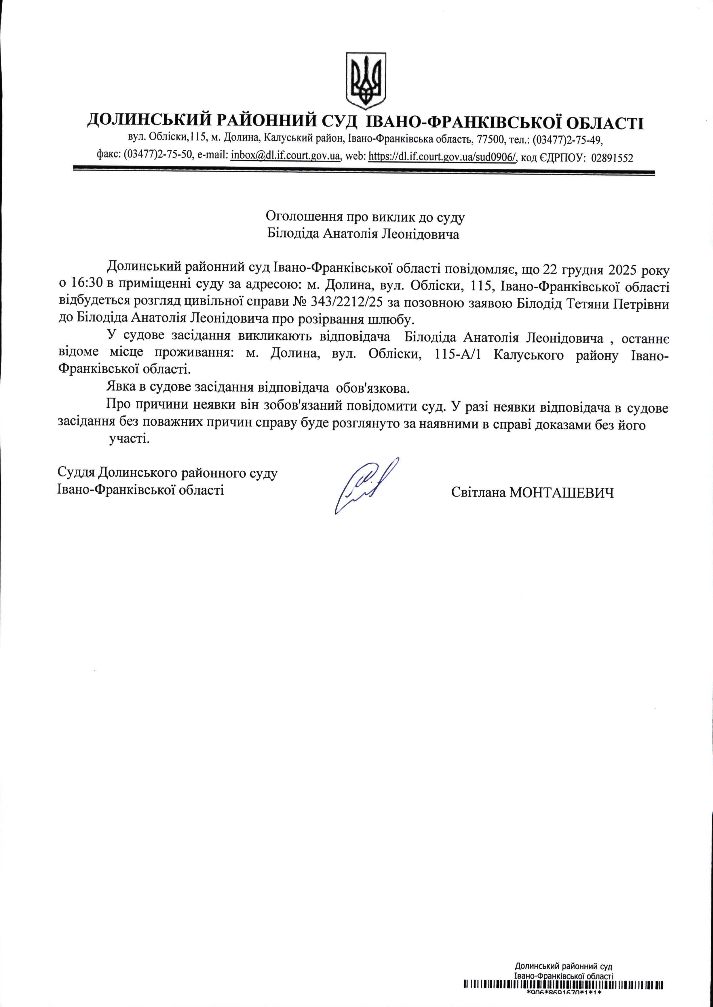 ОГОЛОШЕННЯ ПРО ВИКЛИК до СУДУ Білодіда Анатолія Леонідовича у цивільній справі № 343/2212/25