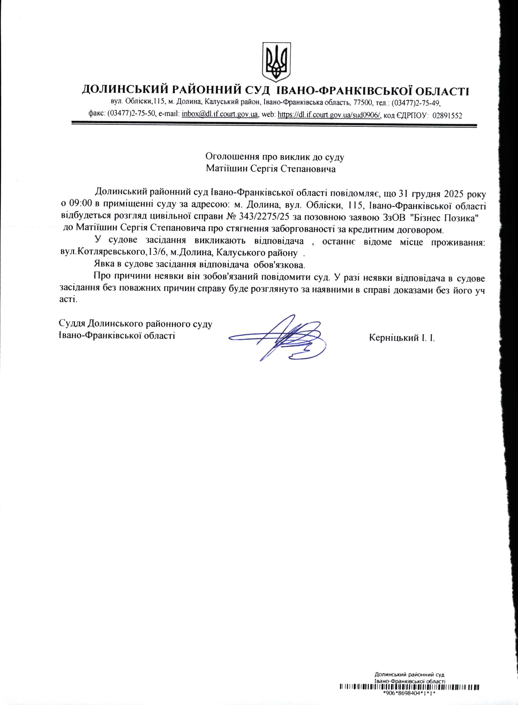 ОГОЛОШЕННЯ ПРО ВИКЛИК до СУДУ Матіїшин Сергія Степановича у цивільній справі № 343/2275/25
