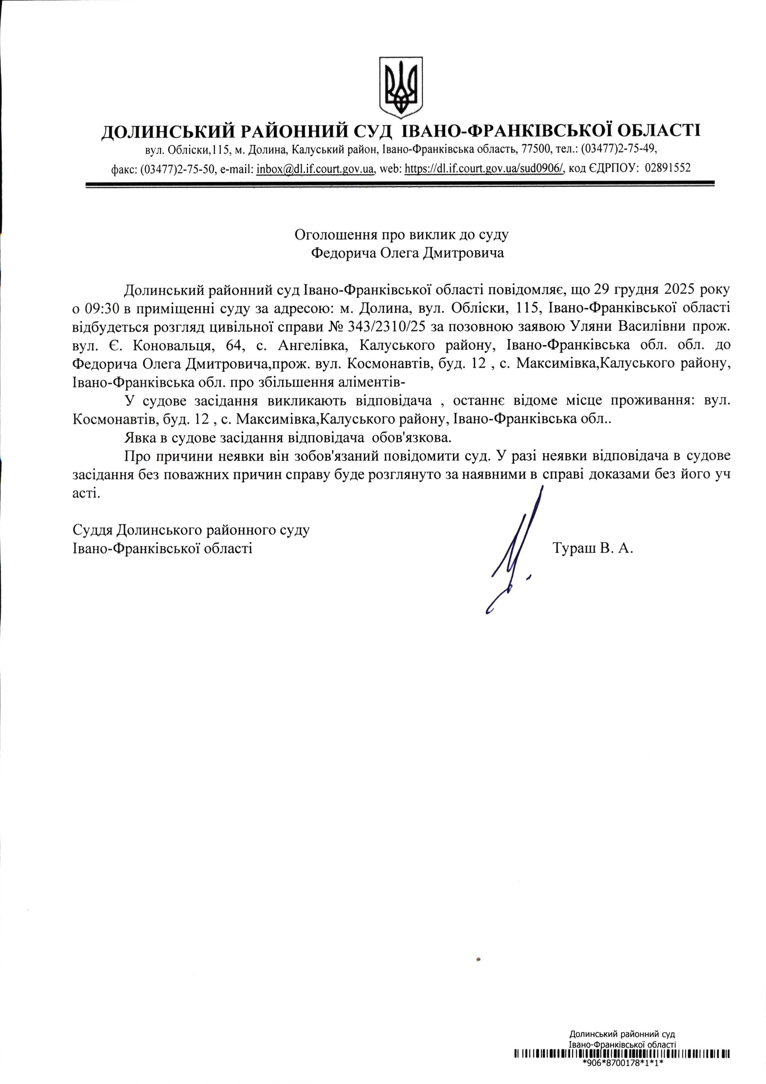 ОГОЛОШЕННЯ ПРО ВИКЛИК до СУДУ Федорича Олега Дмитровича у цивільній справі № 343/2310/25