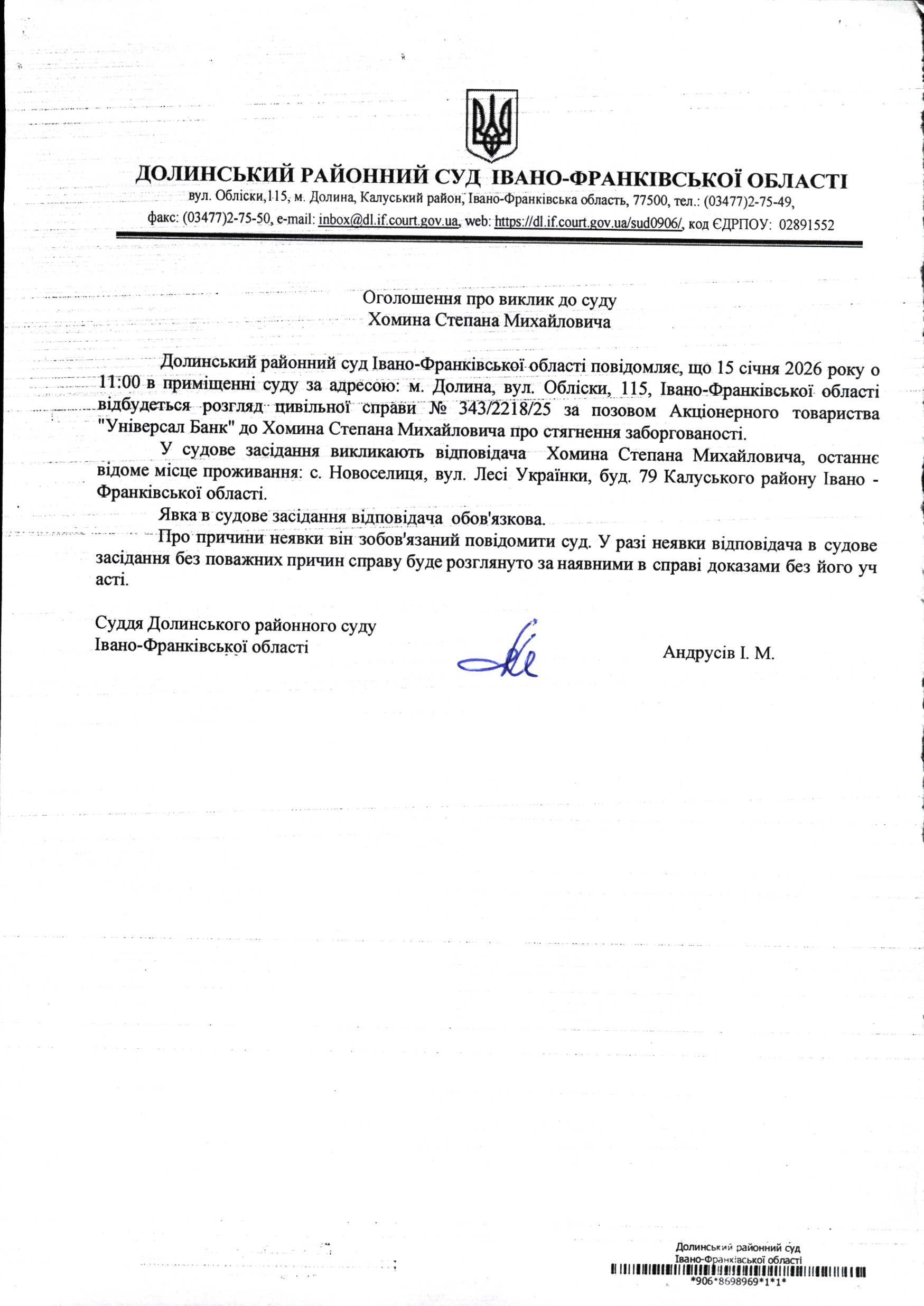 ОГОЛОШЕННЯ ПРО ВИКЛИК до СУДУ Хомина Степана Михайловича у цивільній справі № 343/2218/25