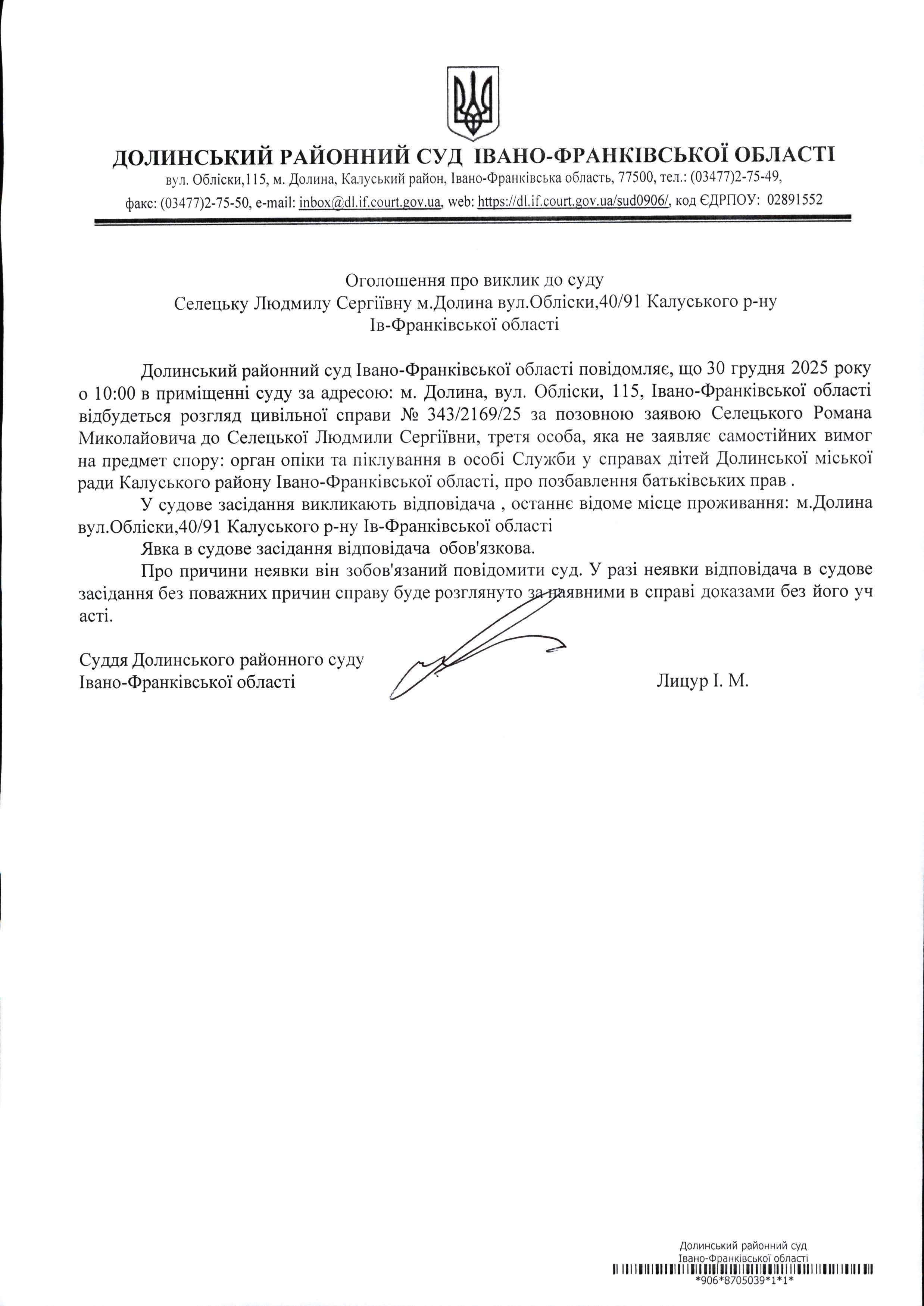 ОГОЛОШЕННЯ ПРО ВИКЛИК до СУДУ Селецьку Людмилу Сергіївну у цивільній справі № 343/2169/25