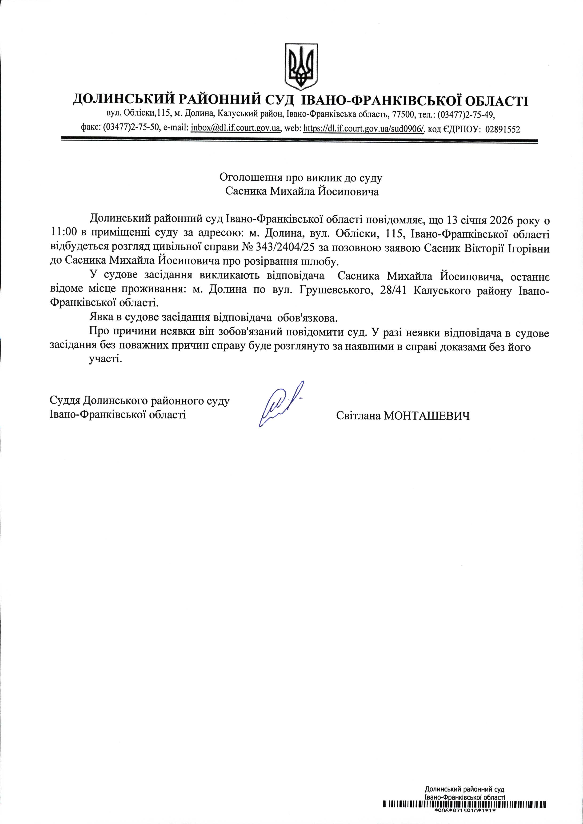 ОГОЛОШЕННЯ ПРО ВИКЛИК до СУДУ Сасника Михайла Йосиповича у цивільній справі № 343/2404/25