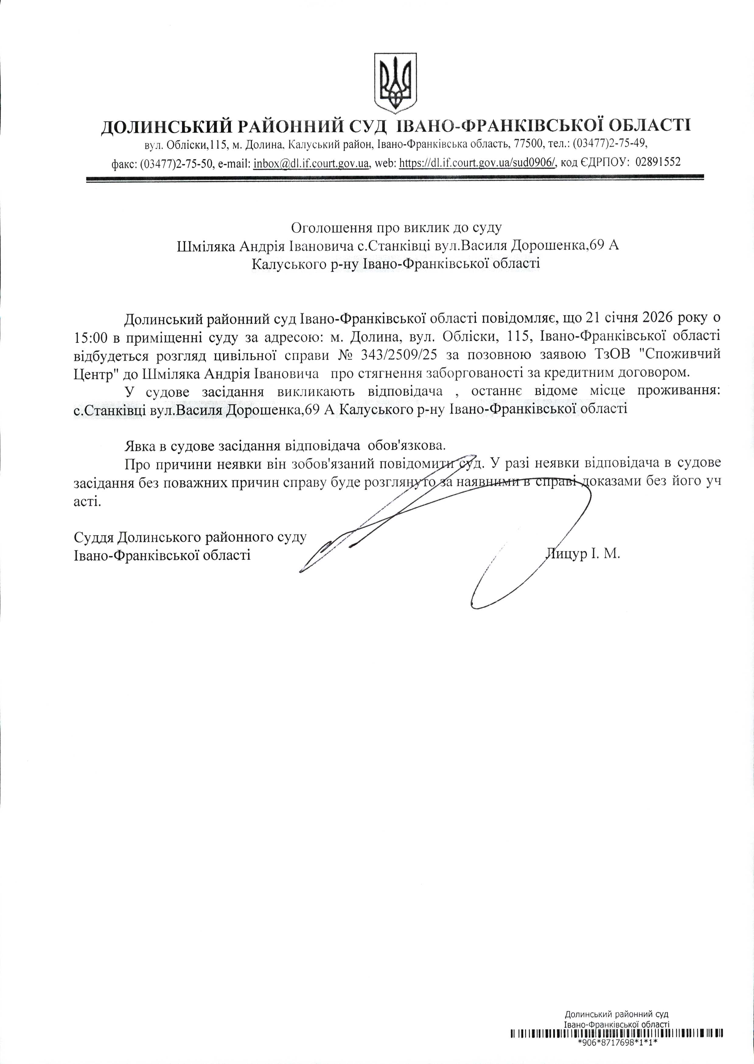 ОГОЛОШЕННЯ ПРО ВИКЛИК до СУДУ Шміляка Андрія Івановича у цивільній справі № 343/2509/25