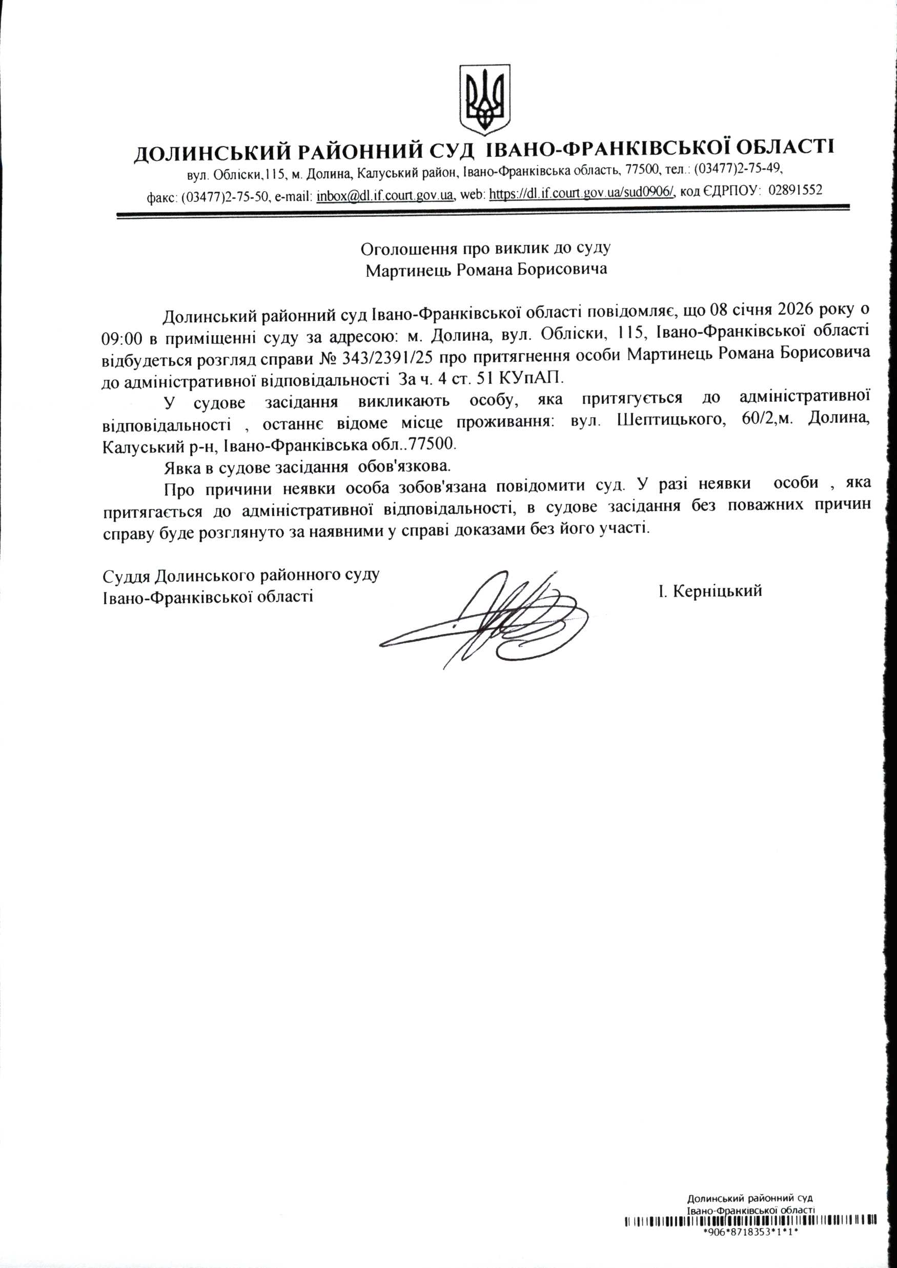 ОГОЛОШЕННЯ ПРО ВИКЛИК до СУДУ Мартинець Романа Борисовича у справі про адміністративне правопорушення № 343/2391/25