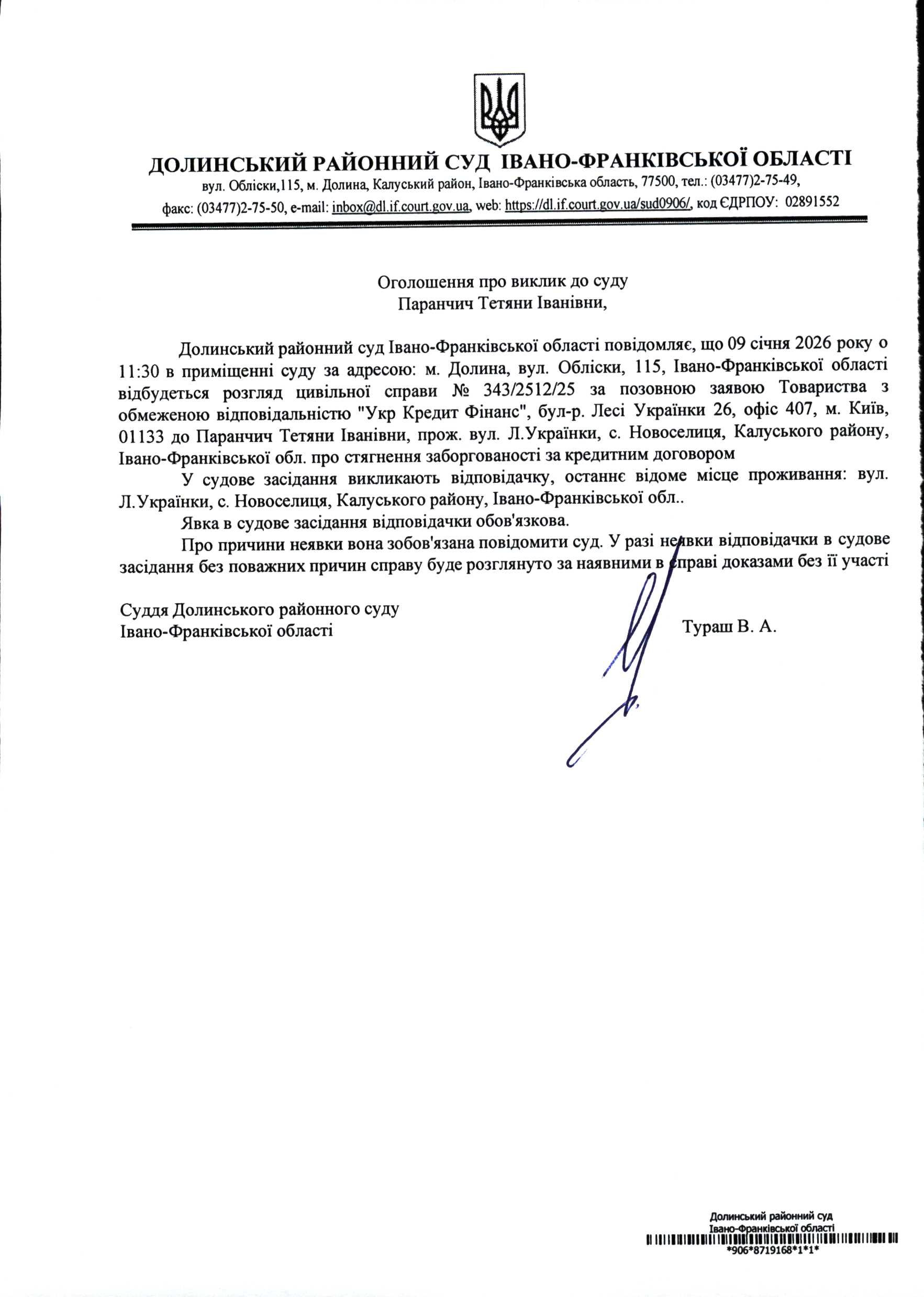 ОГОЛОШЕННЯ ПРО ВИКЛИК до СУДУ Паранчнч Тетяни Іванівни у цивільній справі № 343/2512/25