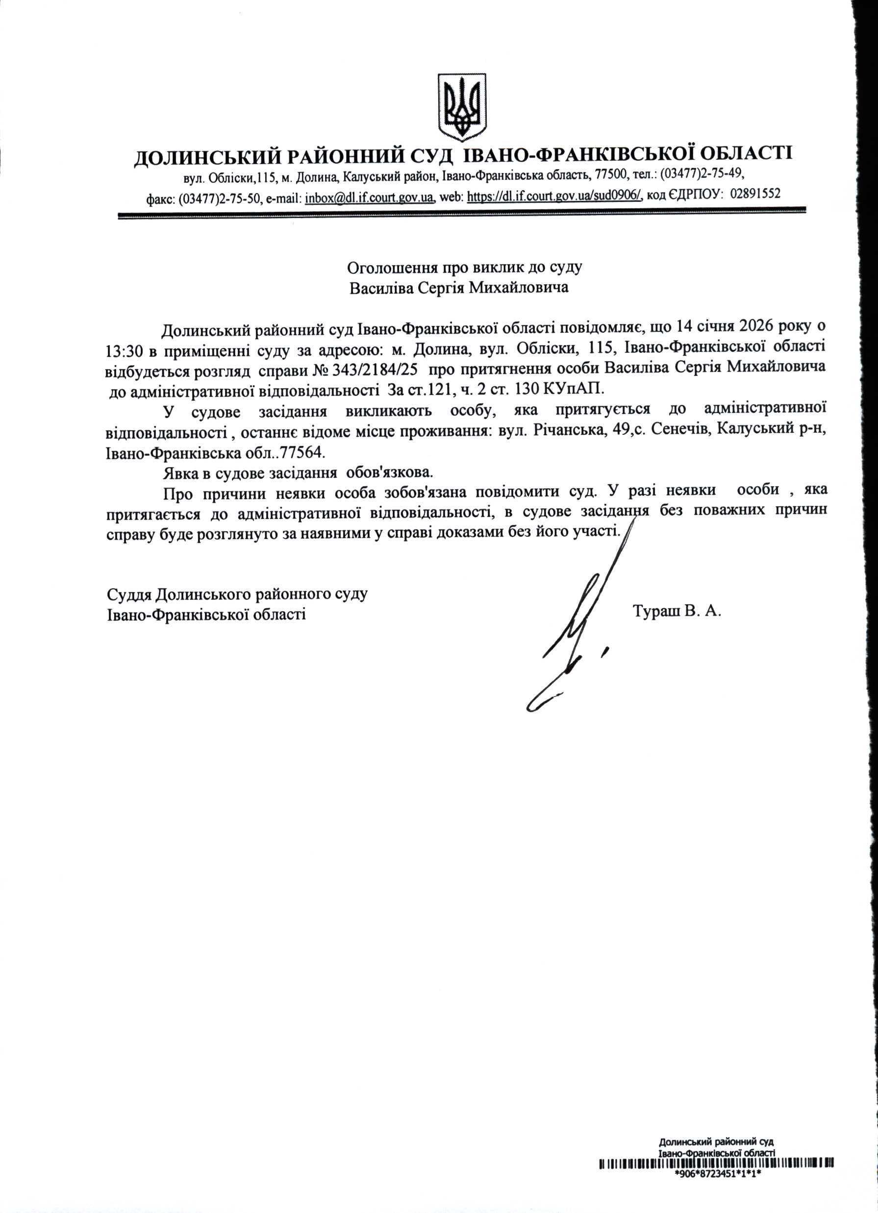 ОГОЛОШЕННЯ ПРО ВИКЛИК до СУДУ Василіва Сергія Михайловича у справі про адміністративне правопорушення № 343/2184/25
