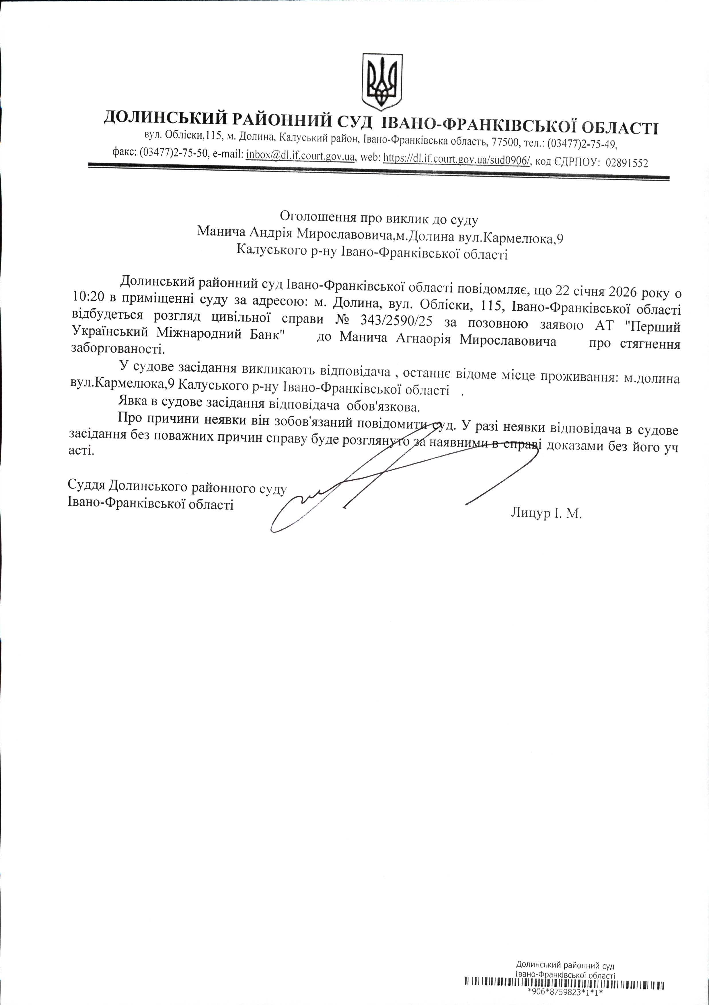 ОГОЛОШЕННЯ ПРО ВИКЛИК до СУДУ Манича Андрія Мирославовича у цивільній справі № 343/2590/25