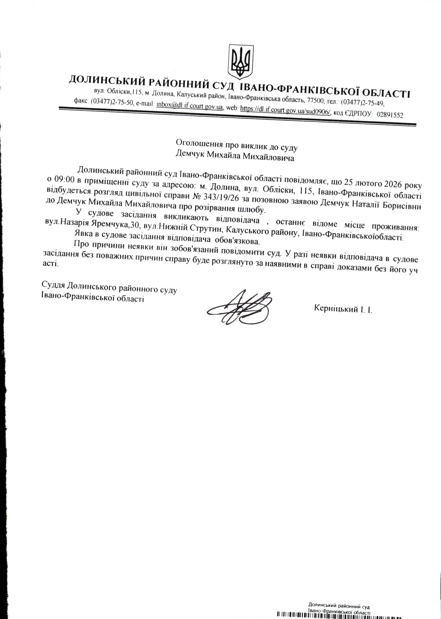 ОГОЛОШЕННЯ ПРО ВИКЛИК до СУДУ Демчук Михайла Михайловича у цивільній справі № 343/19/26
