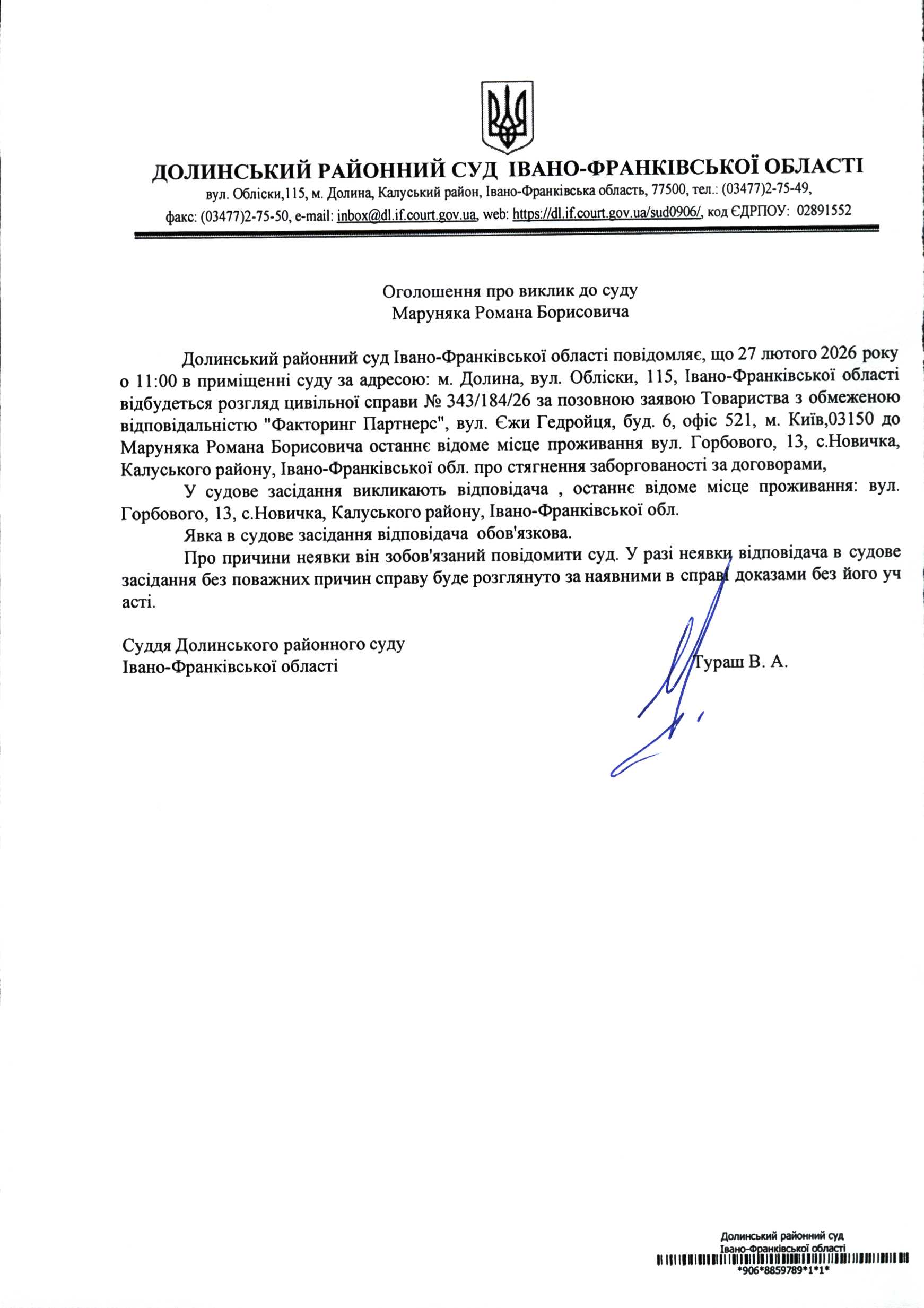ОГОЛОШЕННЯ ПРО ВИКЛИК до СУДУ Маруняка Романа Борисовича у цивільній справі № 343/184/26