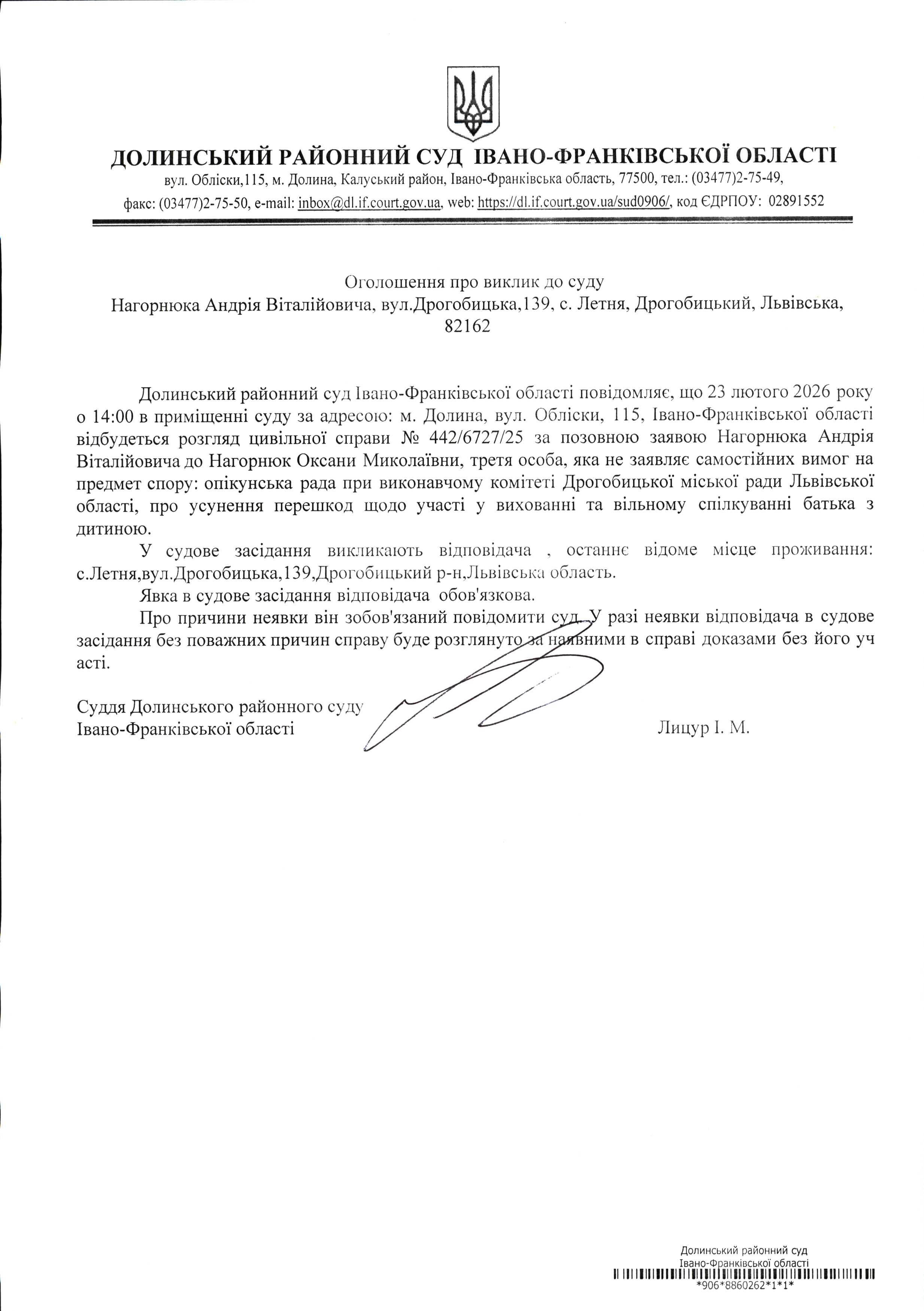 ОГОЛОШЕННЯ ПРО ВИКЛИК до СУДУ Нагорнюка Андрія Віталійовича у цивільній справі № 442/6727/25