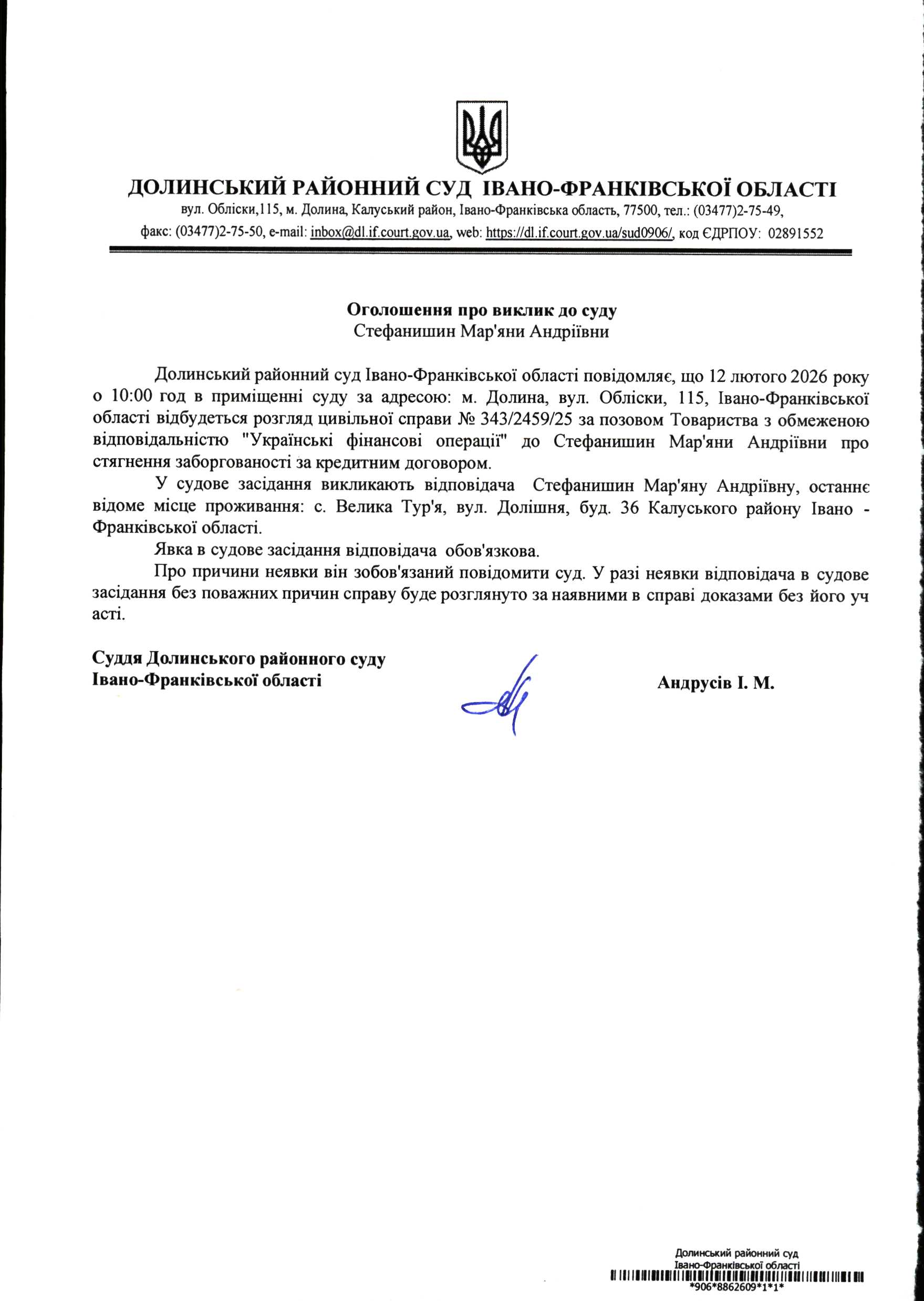 ОГОЛОШЕННЯ ПРО ВИКЛИК до СУДУ Стефанишин Мар'яни Андріївни у цивільній справі № 343/2459/25