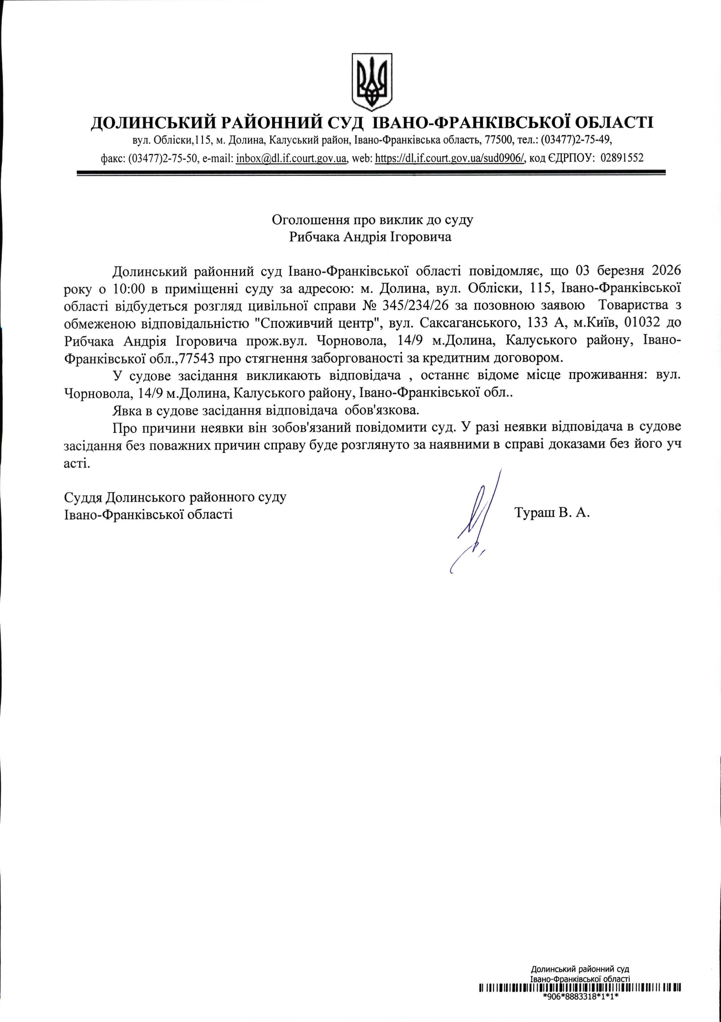 ОГОЛОШЕННЯ ПРО ВИКЛИК до СУДУ Рибчака Андрія Ігоровича у цивільній справі № 343/234/26