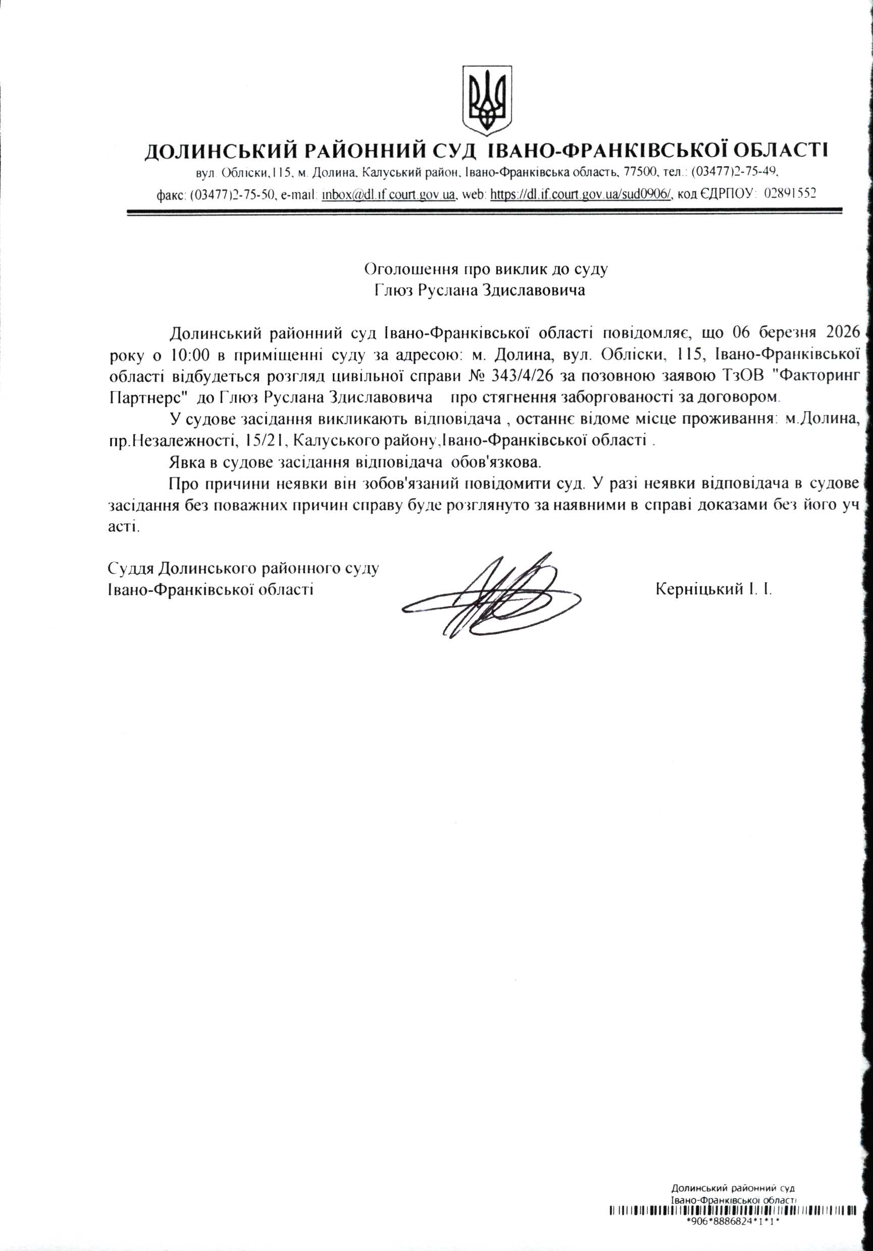 ОГОЛОШЕННЯ ПРО ВИКЛИК до СУДУ Глюз Руслана Здиславовича у цивільній справі № 343/4/26