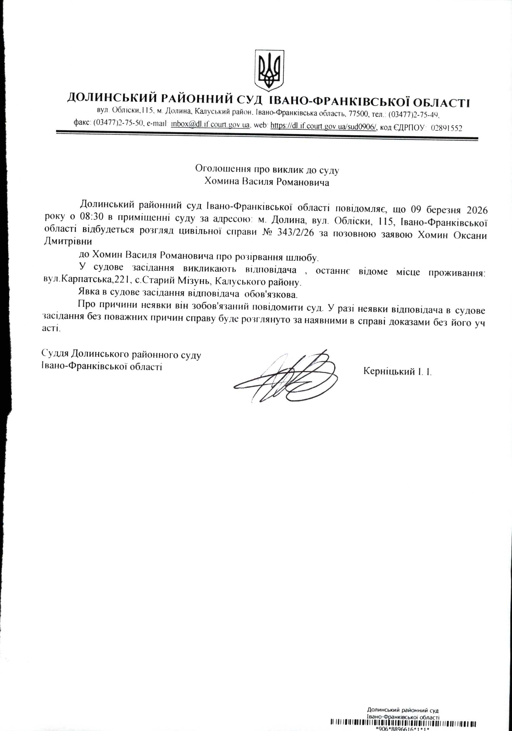 ОГОЛОШЕННЯ ПРО ВИКЛИК до СУДУ Хомина Василя Романовича у цивільній справі № 343/2/26