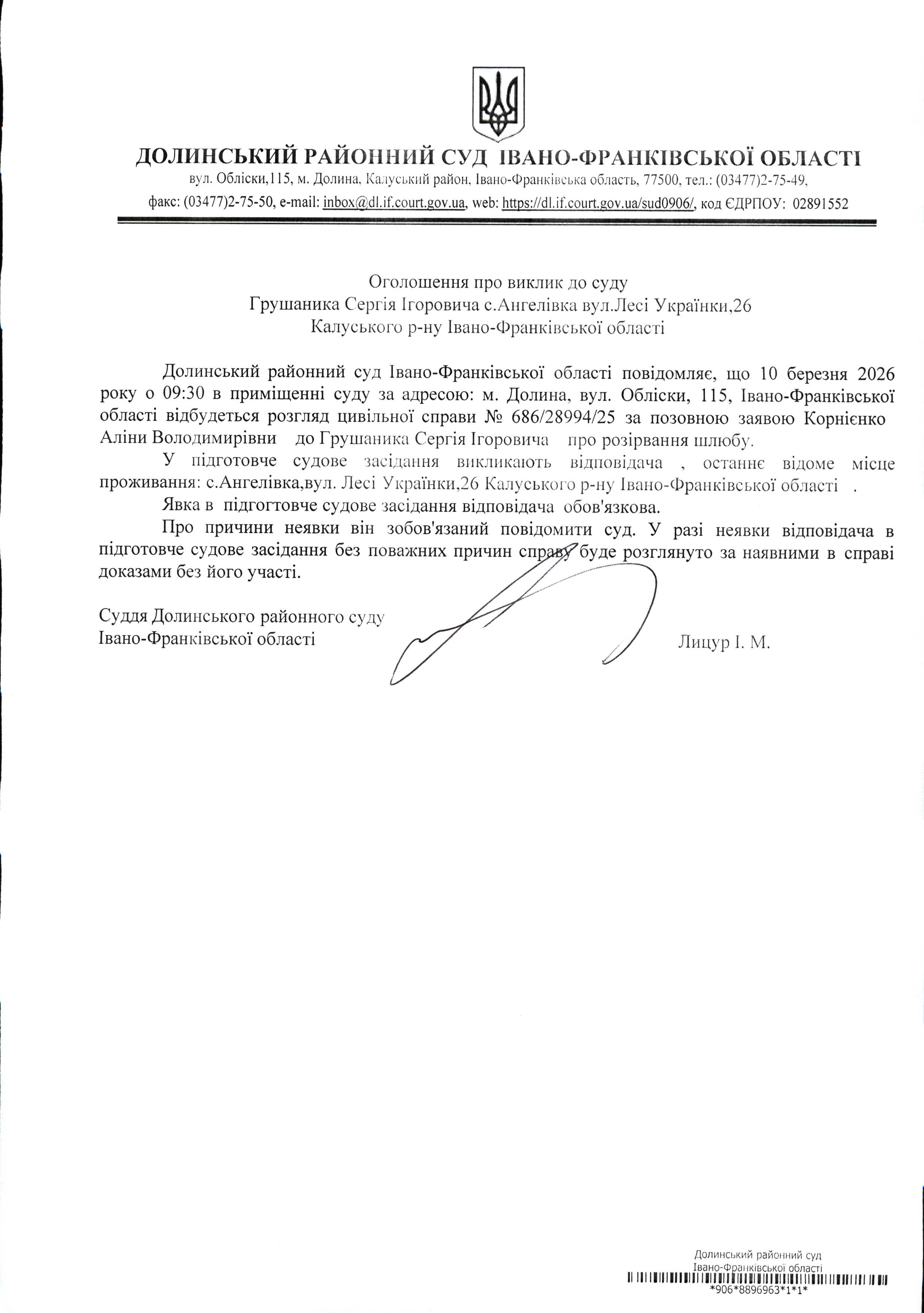 ОГОЛОШЕННЯ ПРО ВИКЛИК до СУДУ Грушаника Сергія Ігоровича у цивільній справі № 686/28994/25