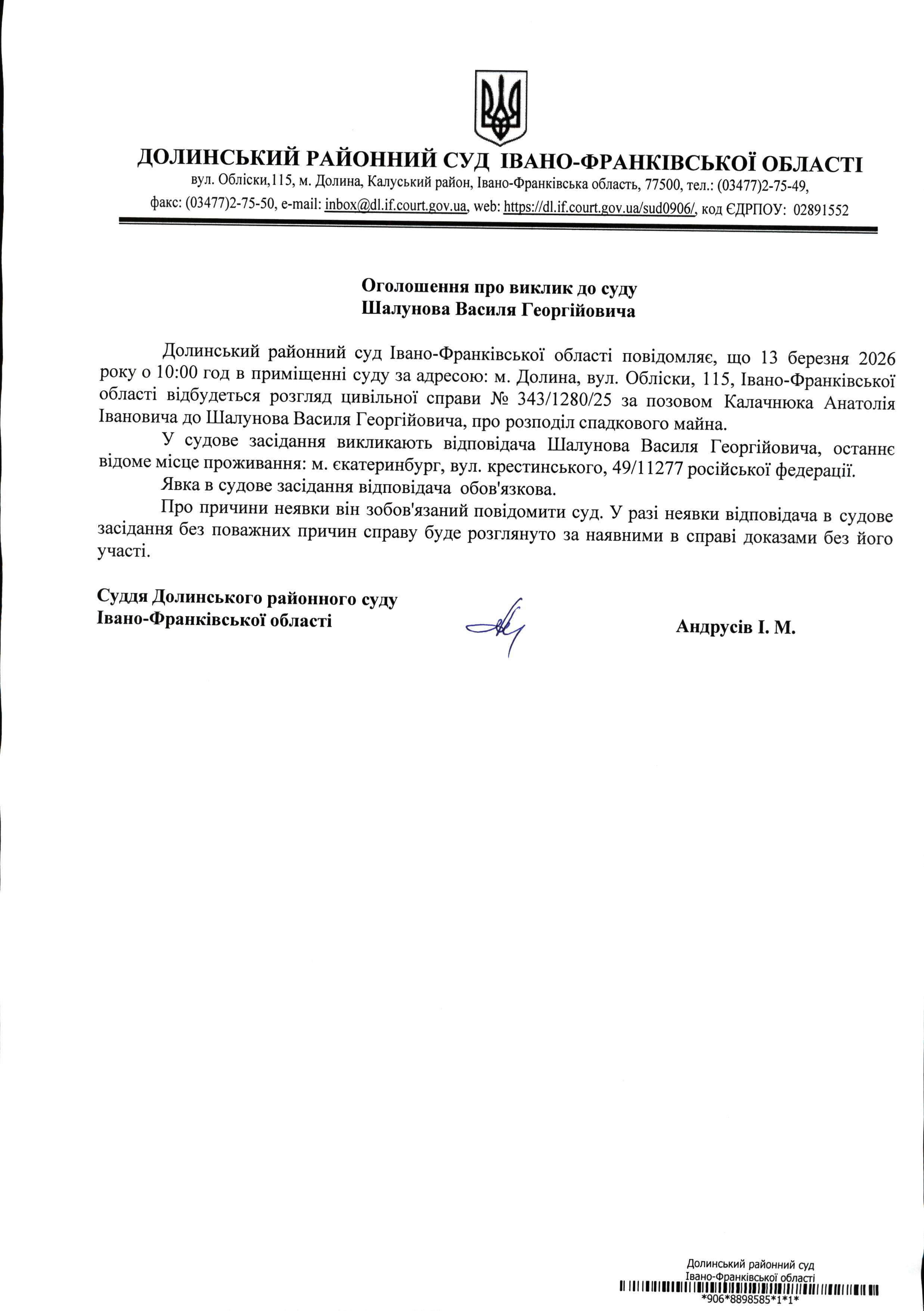 ОГОЛОШЕННЯ ПРО ВИКЛИК до СУДУ Шалунова Василя Георгійовича у цивільній справі № 343/2180/25