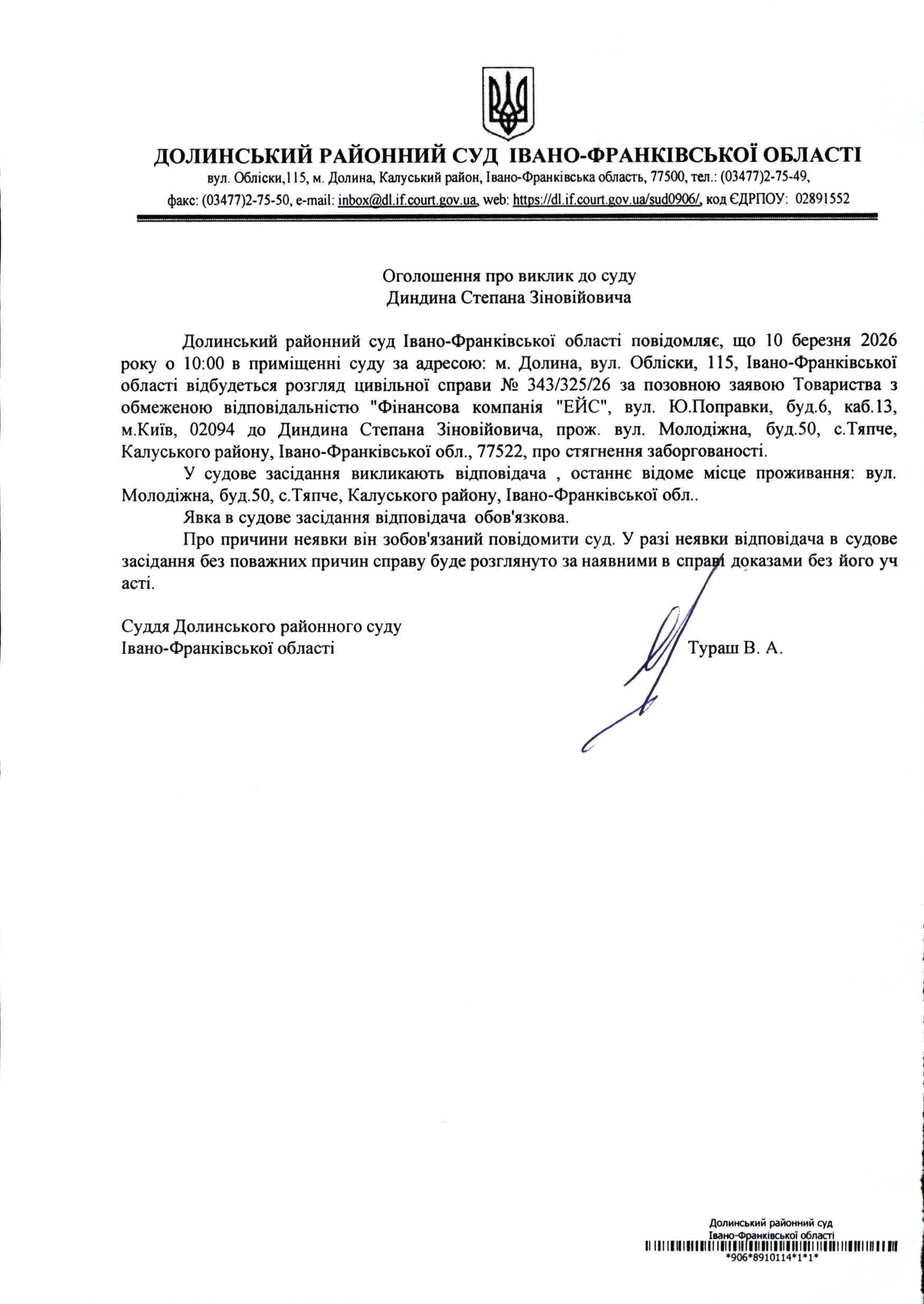 ОГОЛОШЕННЯ ПРО ВИКЛИК до СУДУ Диндина Степана Зіновійовича у цивільній справі № 343/325/26