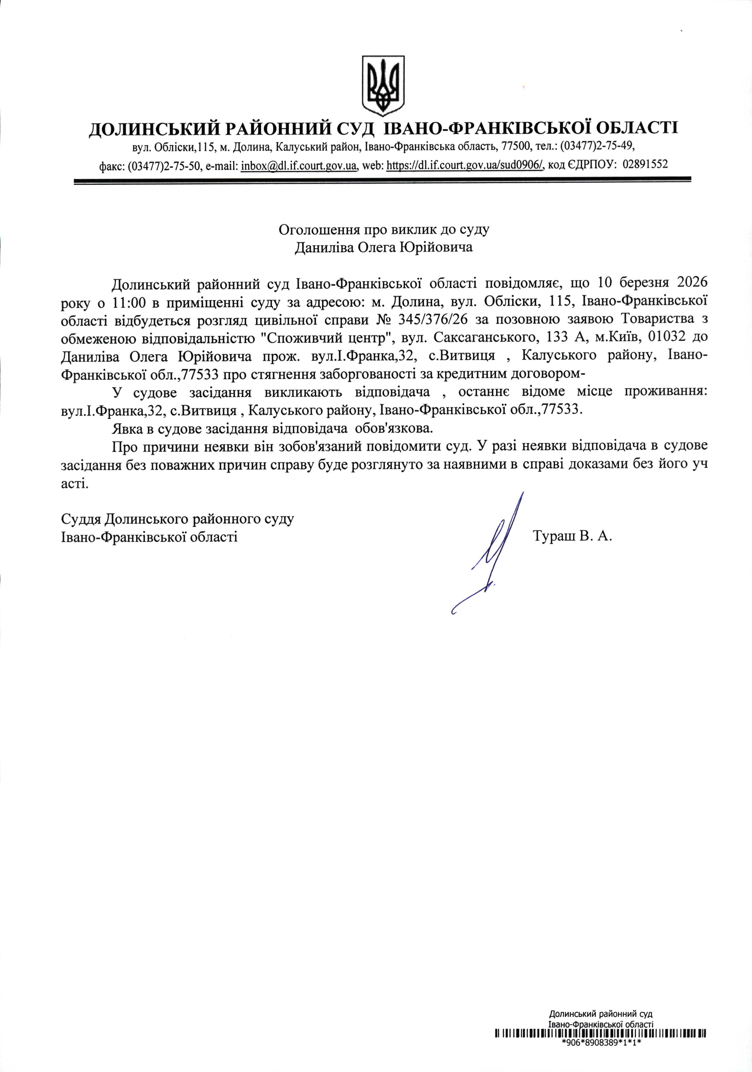 ОГОЛОШЕННЯ ПРО ВИКЛИК до СУДУ Данилів Олега Юрійовича у цивільній справі № 343/376/26